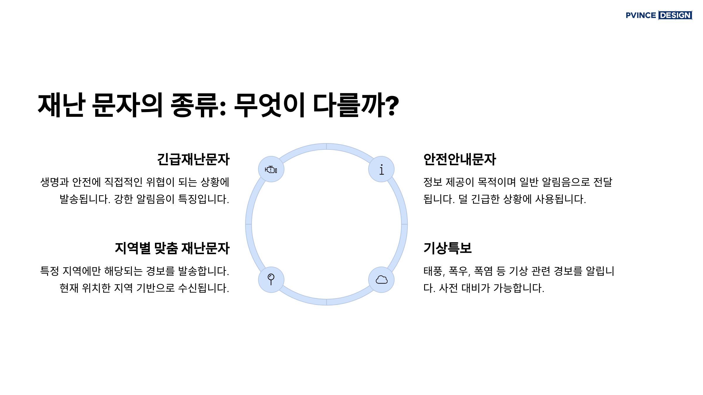 수신 시 특유의 경고음(60dB 이상)이 울리는 것이 특징이며, 이는 위급 상황임을 빠르게 인지시키기 위함입니다. (안전안내문자는 일반 문자음)