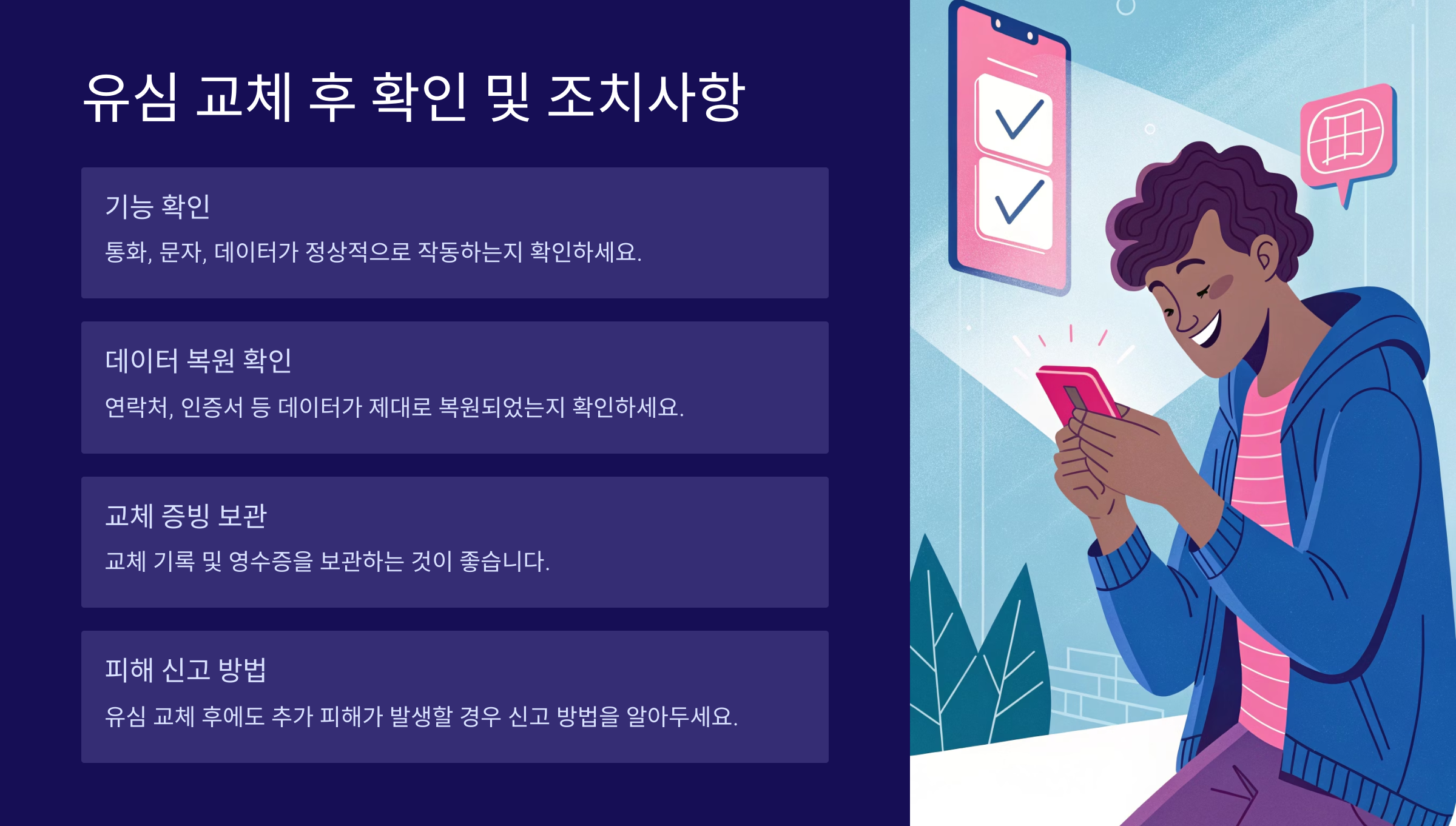 - 📱 통신 서비스 재확인: 현장에서 확인했더라도, 교체 후 일정 시간 동안 통화 수신/발신, 문자 수신/발신, 데이터 통신(Wi-Fi 끄고 확인) 등이 안정적으로 작동하는지 다시 한번 확인합니다. MMS(장문/사진 문자) 수발신도 확인해보세요.