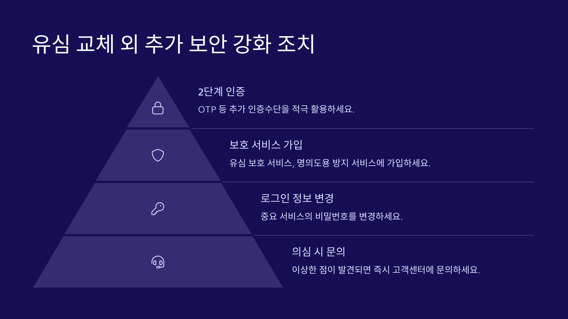 개인정보 유출 사고 발생 시에는 유심 교체뿐만 아니라 이러한 다각적인 보안 조치를 함께 실천하는 것이 소중한 내 정보를 지키는 가장 확실한 방법입니다.