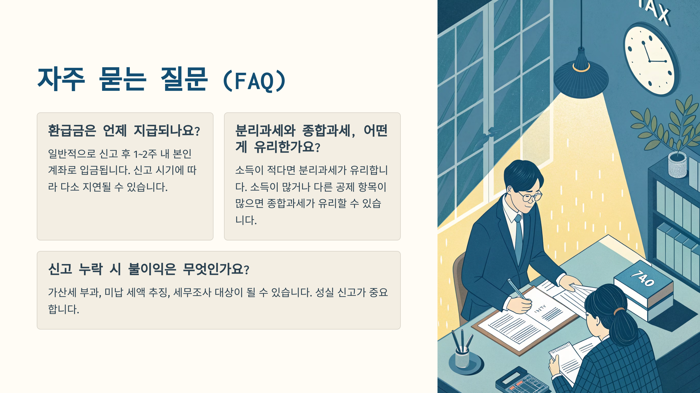 - 분리과세를 선택하면 간편하지만, 환급받을 세금이 있어도 돌려받지 못합니다. 따라서 자신의 총 소득과 공제 내역을 고려하여 종합과세(신고)가 유리한지, 분리과세(미신고)가 유리한지 판단해야 합니다. 대부분의 경우, 소득이 적다면 신고(종합과세)해서 환급받는 것이 유리합니다.