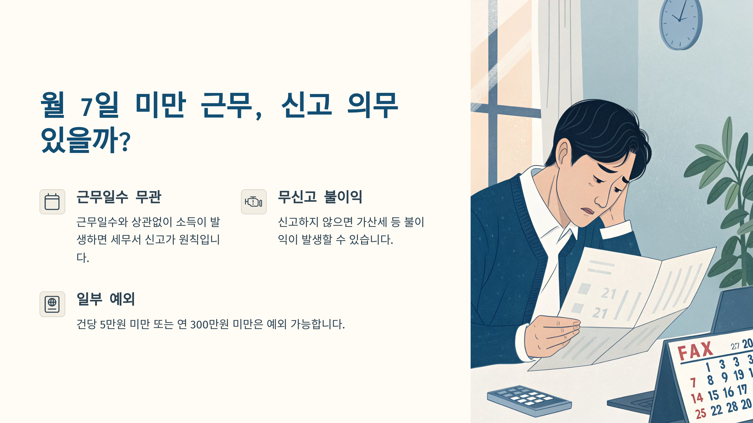 - '일한 날짜'는 신고 의무 판단 기준이 아님: 세법에서는 소득의 종류와 금액을 기준으로 신고 의무를 판단하며, '월 7일 미만 근무'와 같은 근로 일수는 직접적인 기준이 되지 않습니다.