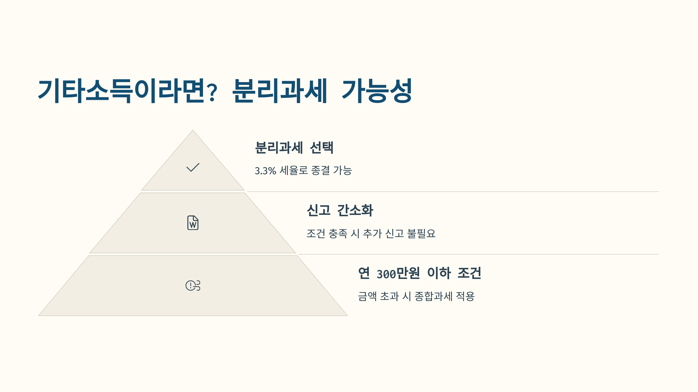 - 분리과세 선택: 위 조건(기타소득 금액 300만원 이하)을 충족하면, 납세자는 '분리과세' 또는 '종합과세' 중 하나를 선택할 수 있습니다.