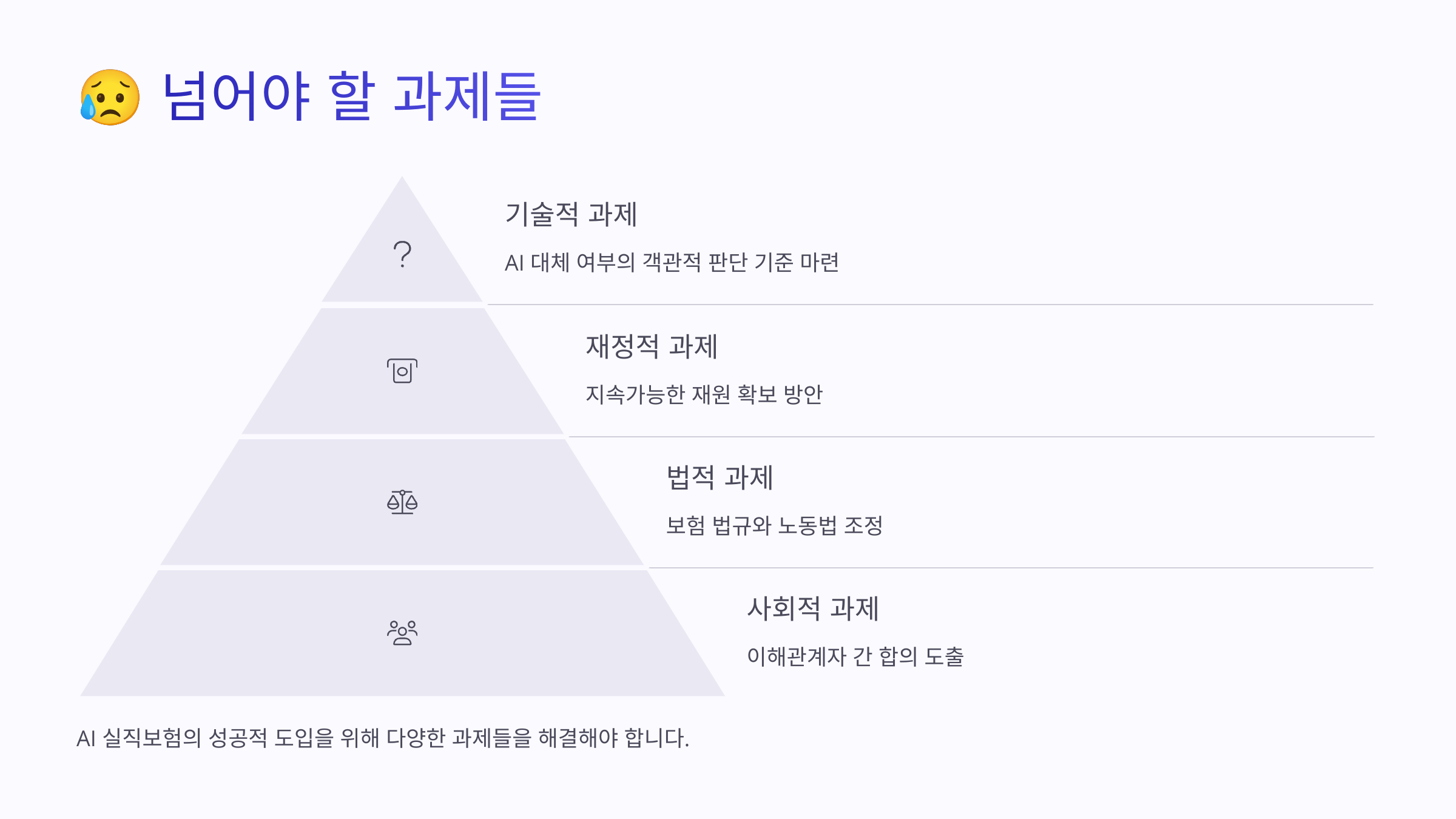 AI 실직보험은 매우 혁신적이고 필요한 아이디어이지만, 실제로 널리 도입되고 효과적으로 운영되기까지는 해결해야 할 여러 가지 과제들이 있습니다.