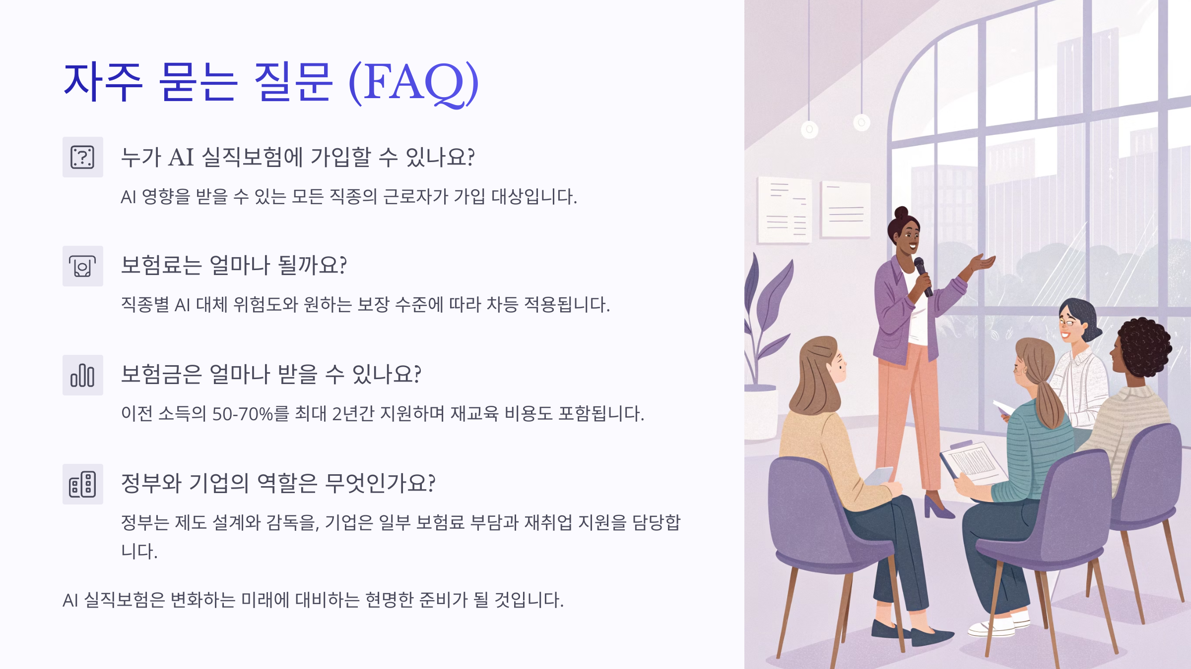 A5. 끊임없는 학습과 자기계발을 통해 변화하는 기술 환경에 적응할 수 있는 역량을 키우는 것이 중요합니다. AI가 대체하기 어려운 창의력, 비판적 사고, 감성 지능, 협업 능력 등을 강화하고, 새로운 기술을 배우는 데 열린 자세를 갖는 것이 필요합니다. 또한, AI 실직보험과 같은 사회적 안전망 논의에도 관심을 가지는 것이 좋습니다.