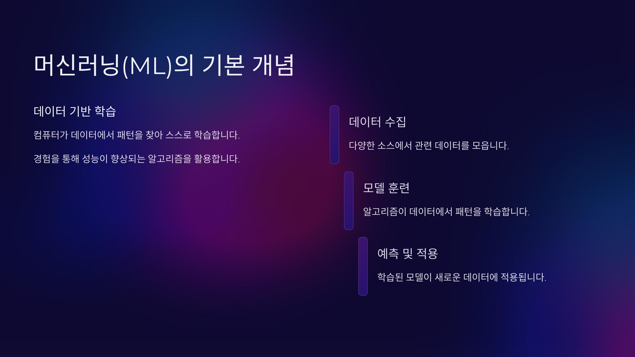 즉, 개발자가 모든 규칙을 일일이 코드로 작성하는 대신, 기계에 많은 양의 데이터를 제공하고 그 데이터 속에서 스스로 규칙이나 패턴을 학습하도록 하는 것입니다. 예를 들어, 수많은 고양이 사진을 학습한 머신러닝 모델은 새로운 사진을 보고 그것이 고양이인지 아닌지를 판단할 수 있게 됩니다.