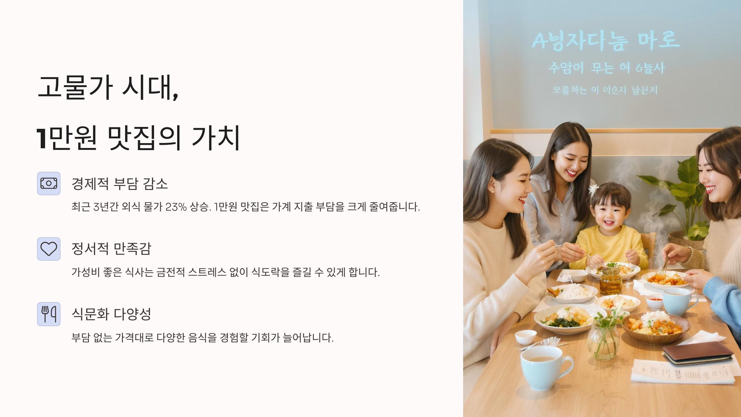 외식 물가가 치솟은 2025년, 1만원 한 장으로 배부르게 먹을 수 있는 식당을 찾는 건 더 이상 쉽지 않습니다. 하지만 전국 곳곳에는 여전히 넉넉한 인심과 푸짐한 양, 착한 가격을 자랑하는 숨은 맛집들이 존재합니다. 오늘은 서울·경기, 부산, 제주 등 전국 각지에서 1만원으로 든든하게 한 끼를 즐길 수 있는 가성비 식당을 엄선해 소개합니다. 혼밥, 데이트, 가족 외식, 직장인 점심까지 모두 만족할 만한 곳들만 담았습니다.
