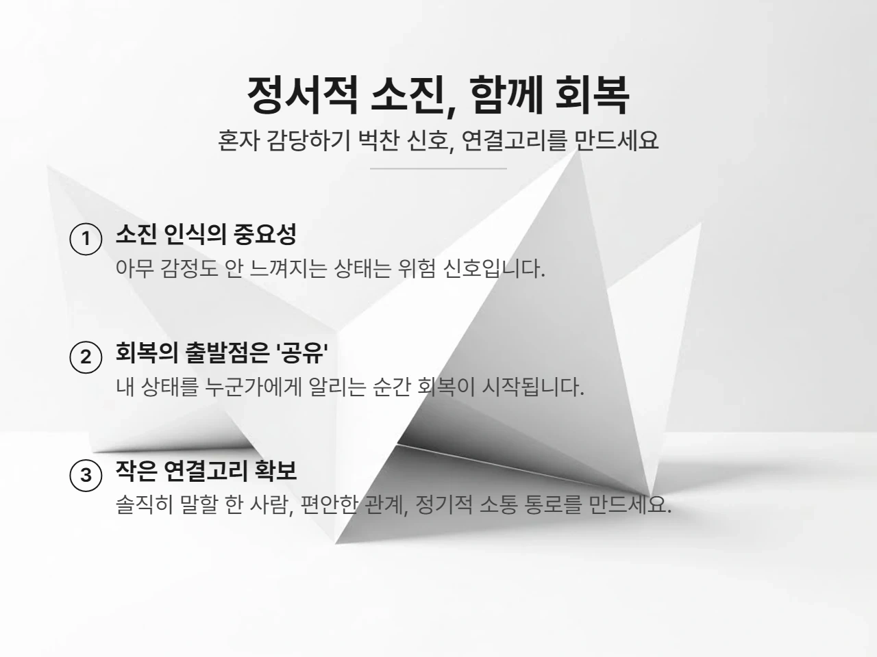 그래서 이 단계에서는 이렇게 인정해야 합니다. '내가 약해서 도움이 필요한 게 아니라, 이 상태 자체가 혼자 감당하기엔 벅찬 구간이구나.' 여기서 말하는 연결은 거창한 위로나 긴 상담이 아닙니다. '요즘 좀 지친 것 같아'라고 말할 수 있는 사람 한 명, 굳이 상태를 다 설명하지 않아도 되는 관계 하나, 정기적으로 얼굴이나 목소리가 오가는 통로 하나… 이 정도면 충분해요.
