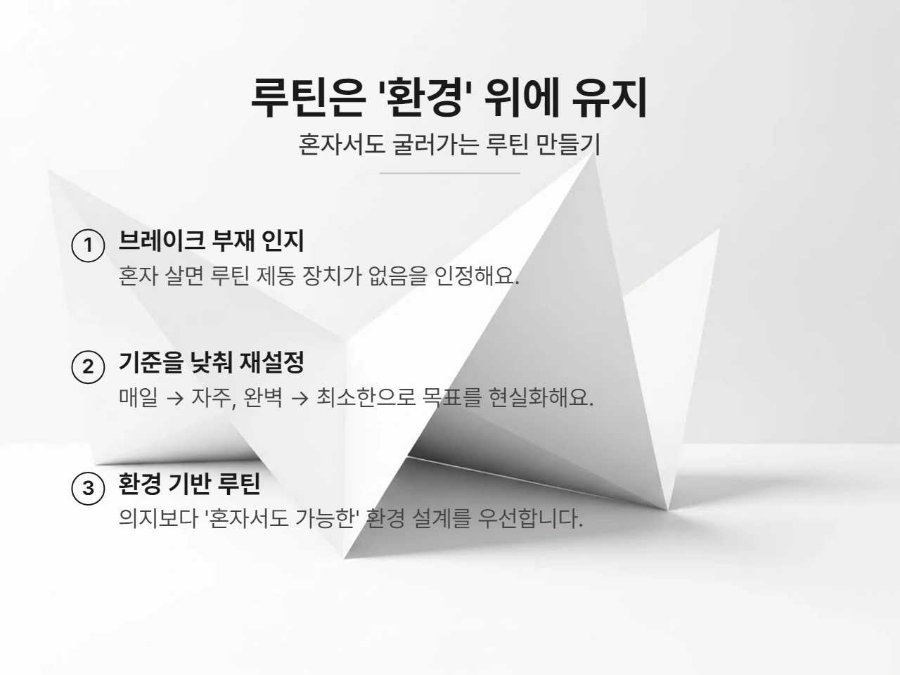 혼자 사는 사람에게 필요한 루틴은 대단할 필요가 없습니다. 그래서 루틴을 다시 세울 때는 의욕을 올리는 게 아니라 '기준을 낮춰야' 합니다. 매일이 아니라 자주, 완벽이 아니라 최소한, 의지가 아니라 시간표로 바꾸는 것이죠.
