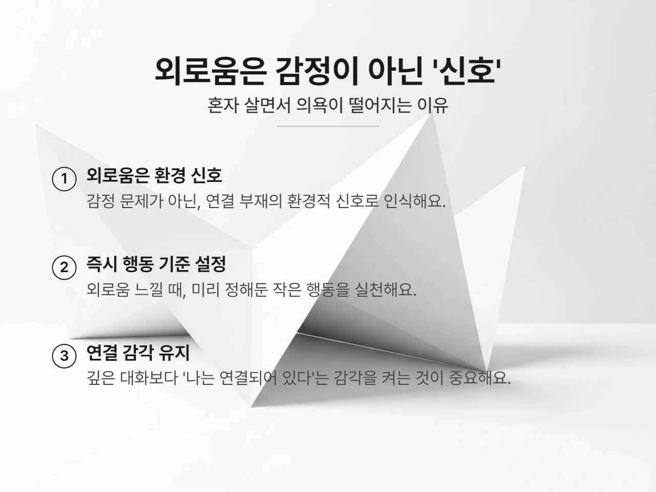 그래서 혼자 살면서 가장 먼저 바꿔야 할 건 감정이 아니라 '해석'입니다. 외로움이 느껴질 때 '내가 왜 이러지?'라고 묻지 말고, '지금은 사람과의 연결이 거의 없는 상태구나'라고 받아들이는 겁니다.