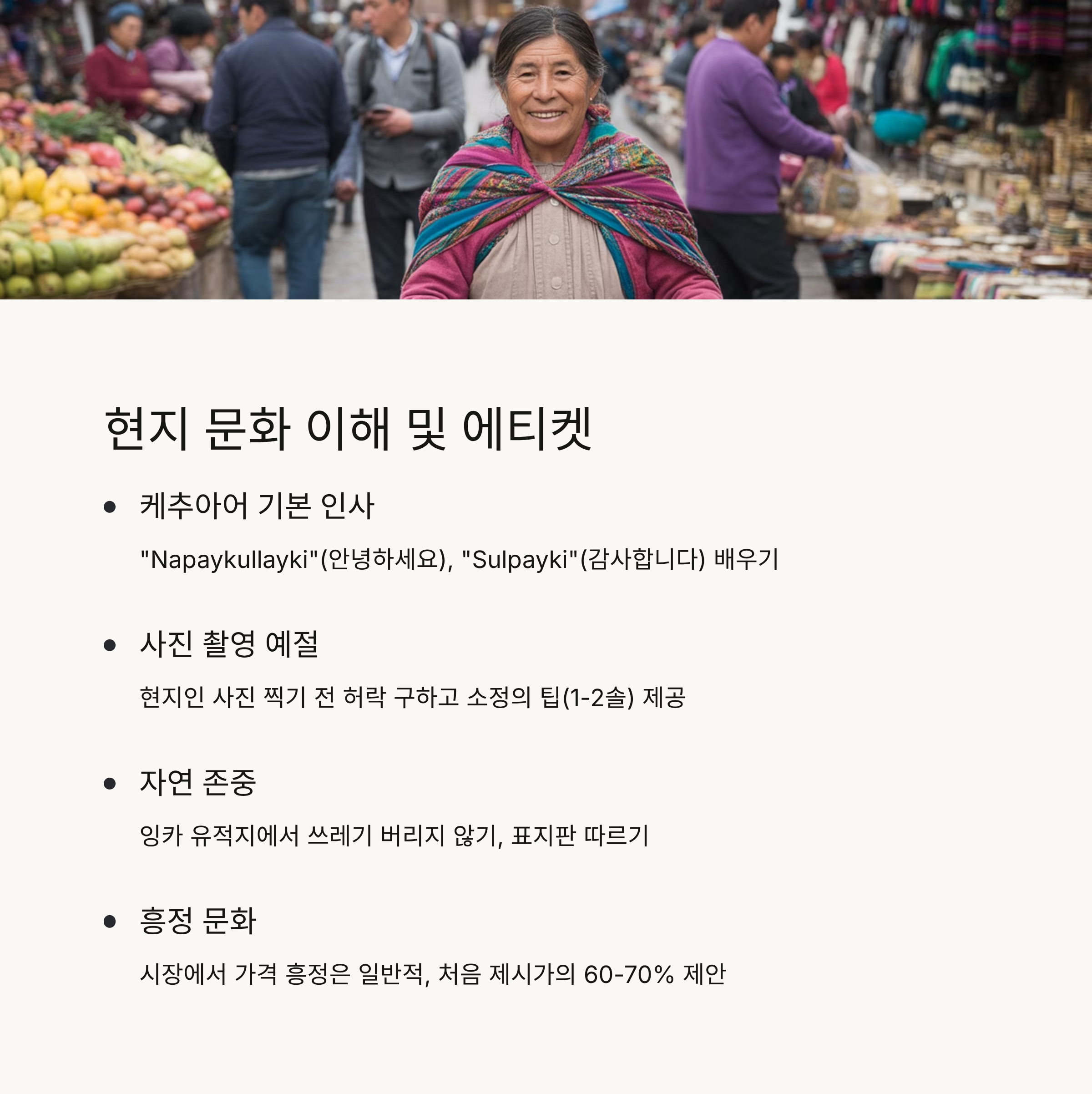 | 언어 | 스페인어(공용), 케추아어(원주민어) 기본 인사말 익히기 | 현지인과의 원활한 소통, 친밀감 형성 |