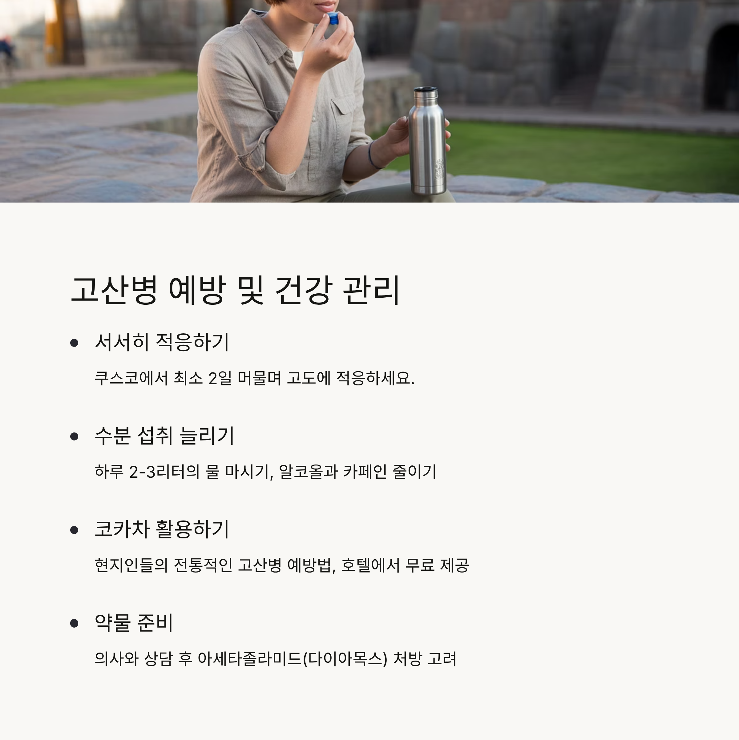 고산병은 누구에게나 올 수 있으니, 자신은 괜찮을 것이라는 생각보다는 미리 예방하고 대비하는 자세가 중요합니다. 건강한 몸으로 마추픽추의 신비를 온전히 만끽하세요! 💯
