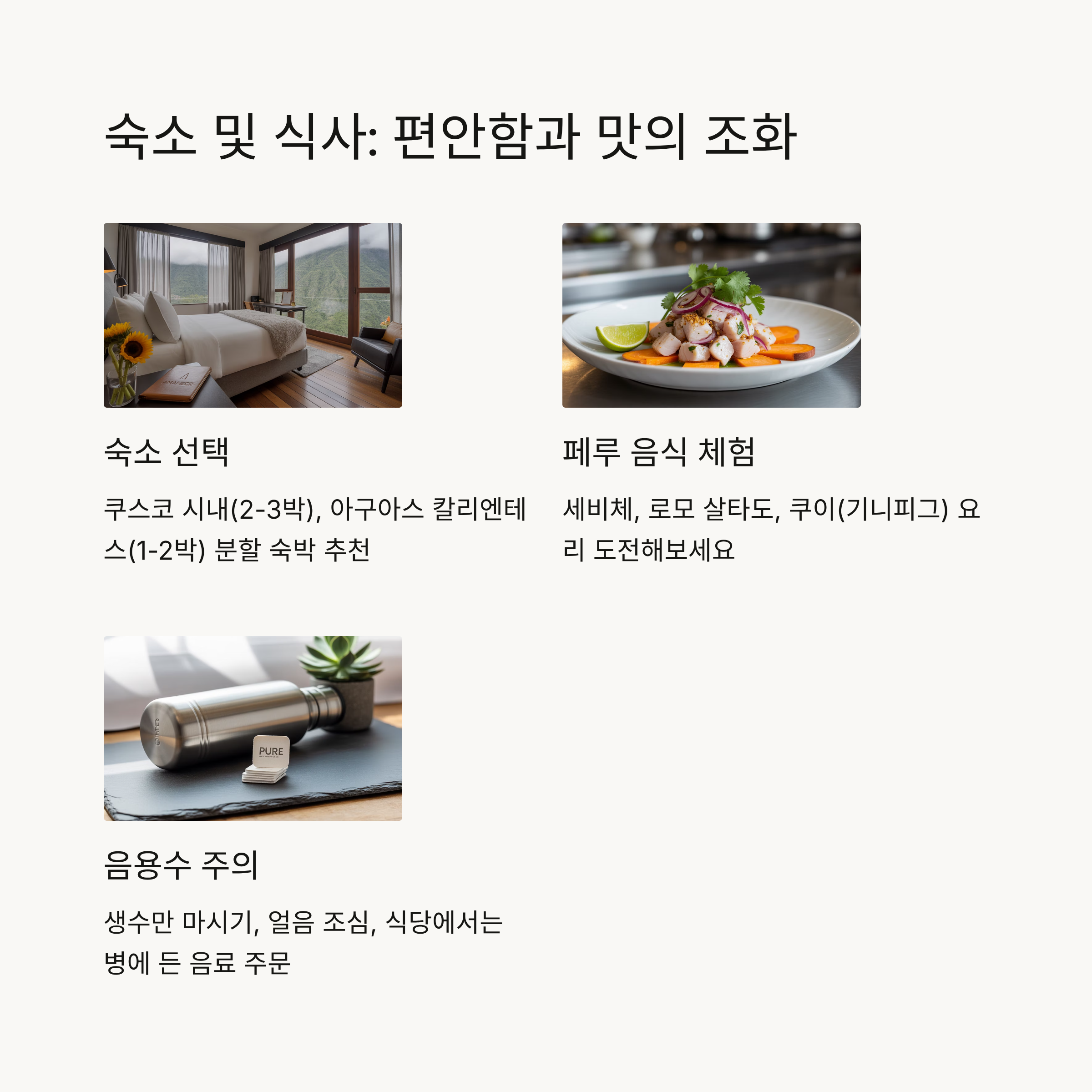 다음 섹션에서는 마추픽추 여행 중 '숙소와 식사'에 대한 팁을 알아볼게요. 편안하고 맛있는 여행을 위한 가이드입니다! 🏨