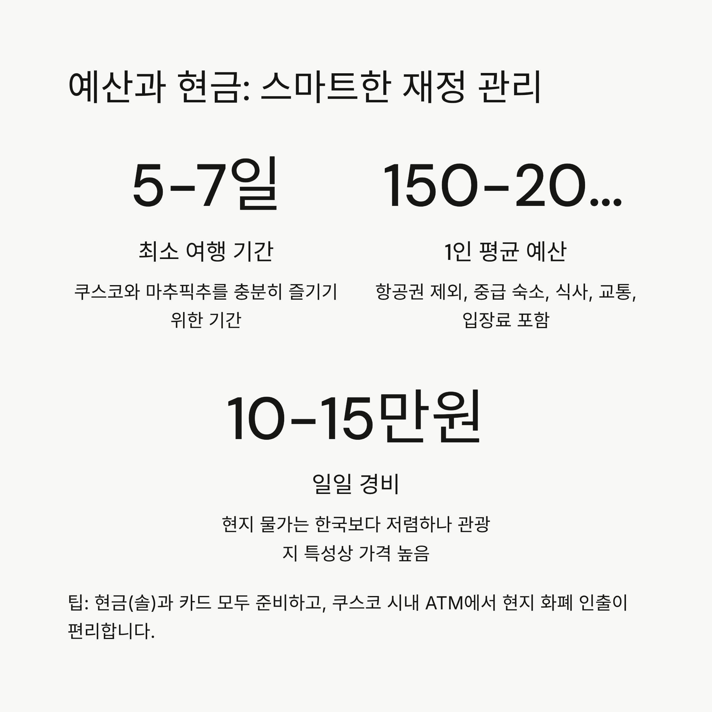 즉, 마추픽추 여행 준비는 단순히 짐을 싸는 것을 넘어, '건강', '예약', '안전', 그리고 '비용'이라는 핵심 요소들을 미리 관리하여 여행의 모든 순간을 온전히 즐기기 위한 필수 과정이라고 할 수 있습니다. 💯