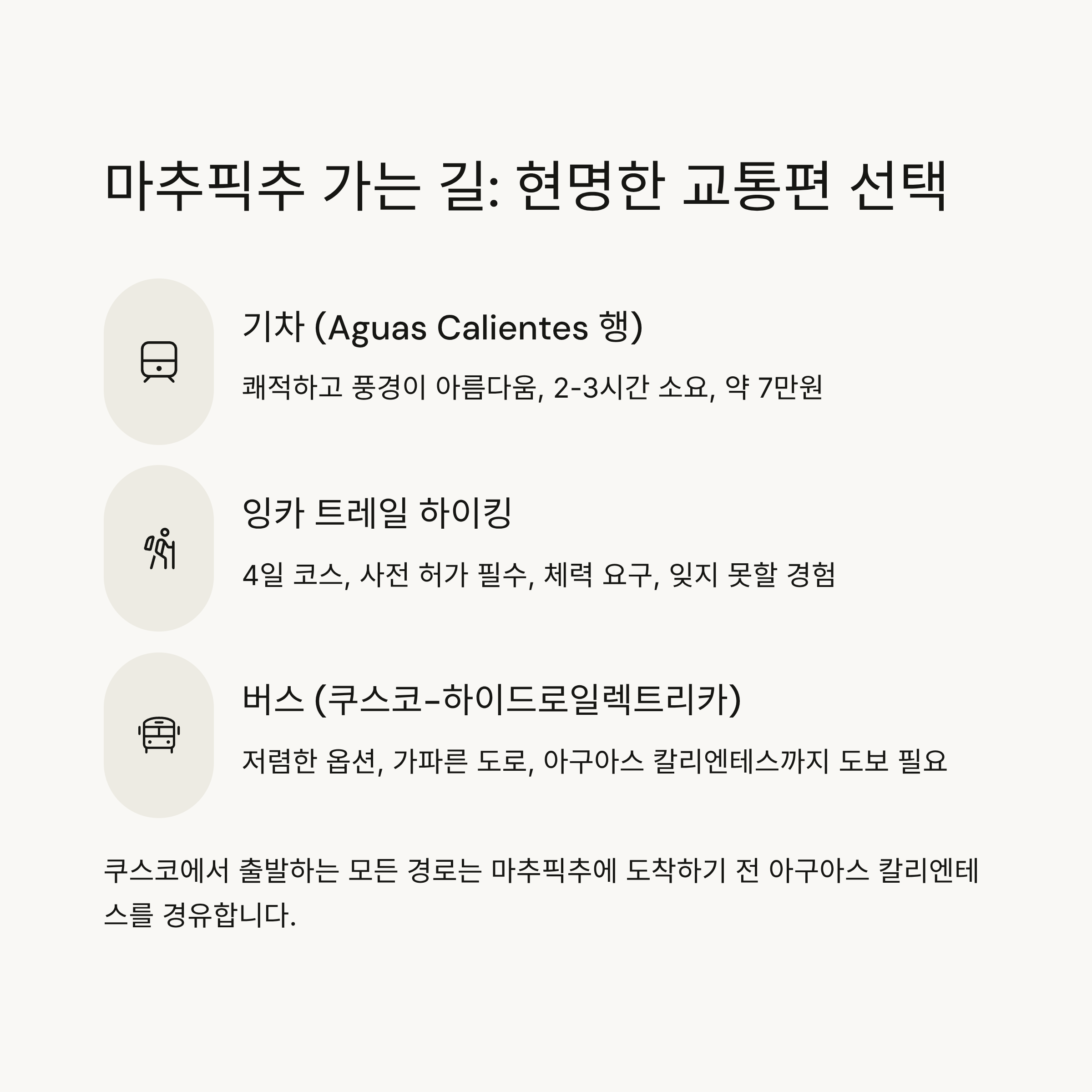 다음 섹션에서는 마추픽추로 가는 '교통편 선택'에 대해 자세히 알아볼게요. 어떤 방법으로 신비로운 잉카 도시까지 갈 수 있을까요? 🚂