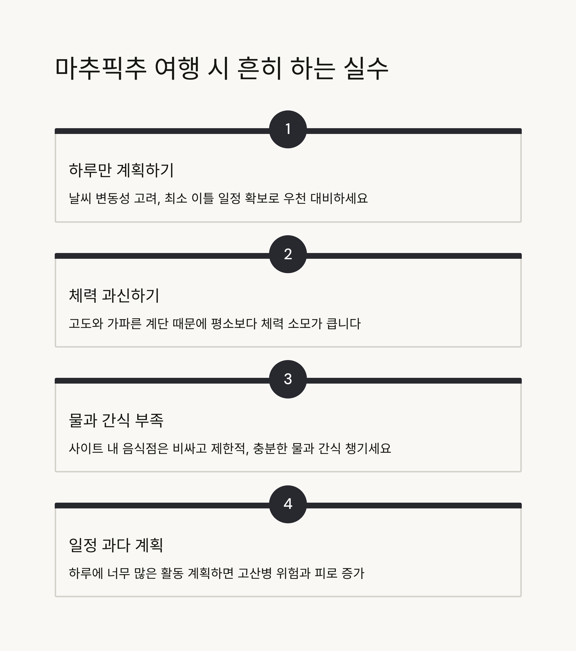 다음 섹션에서는 마추픽추 여행 시 '초보자들이 흔히 하는 실수들'을 짚어드릴게요. 현명한 여행을 위해 꼭 알아두세요! ⚠️