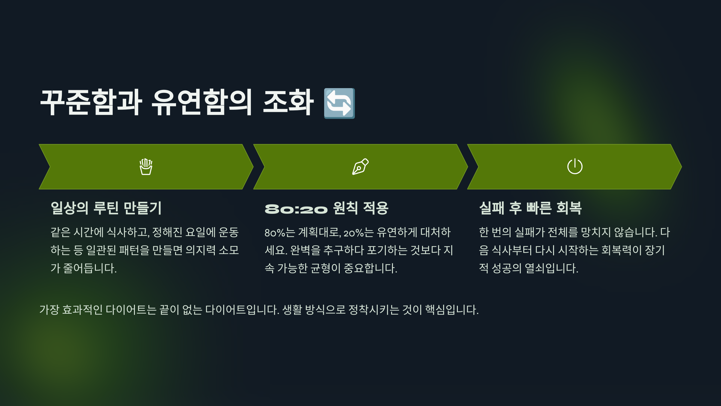 다이어트는 단거리 경주가 아닌 마라톤입니다. 10kg 감량에 성공한 사람들은 일회성 변화가 아닌, 평생 지속할 수 있는 습관을 만드는 데 집중했습니다. 이 과정에서 '꾸준함'과 '유연함'의 조화가 중요합니다.