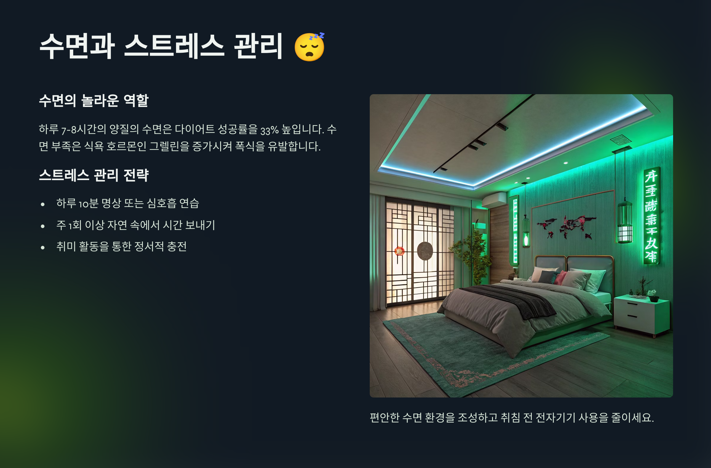 의외로 간과하기 쉬운 부분이 바로 수면과 스트레스 관리입니다. 이 두 가지는 다이어트 성공에 생각보다 큰 영향을 미칩니다.