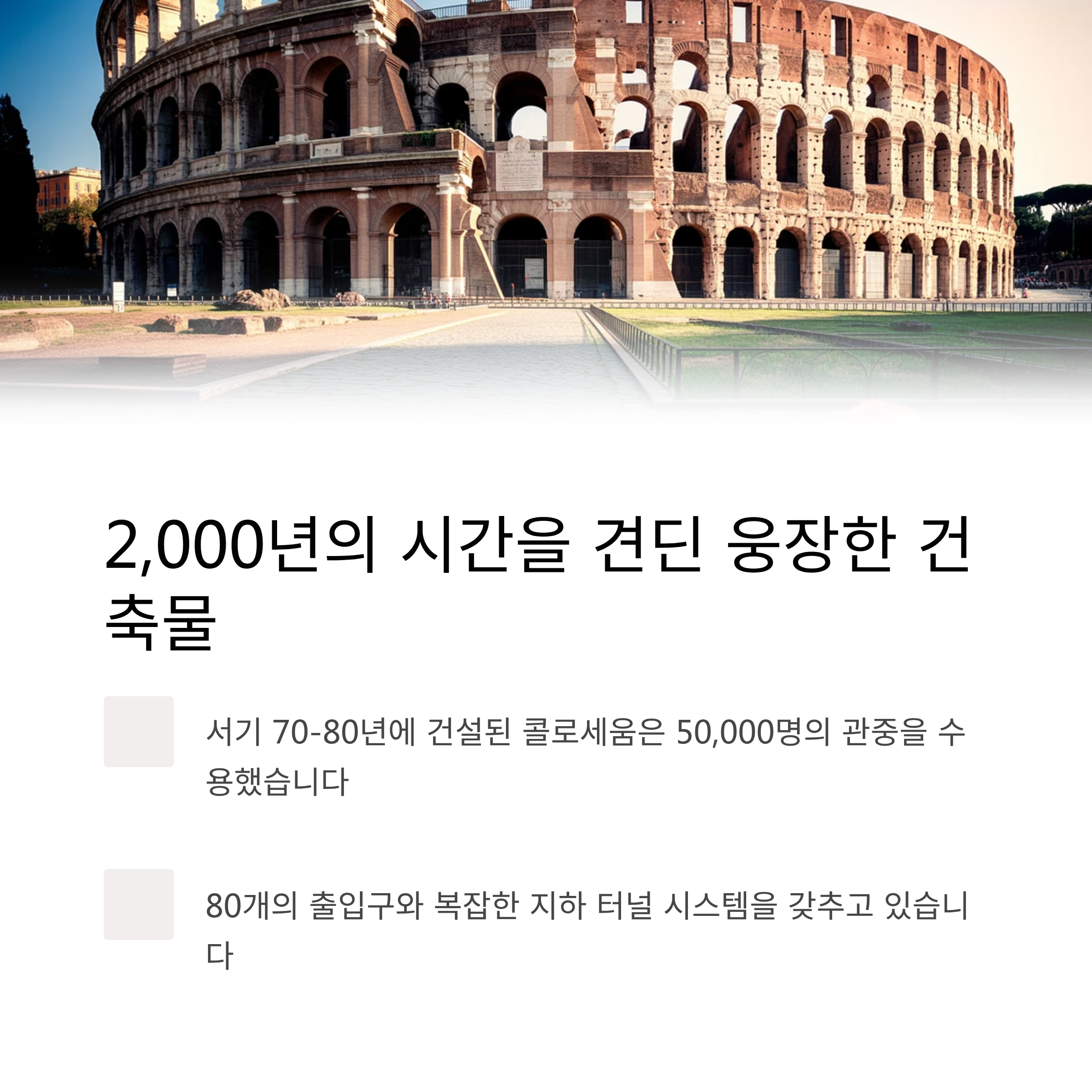 자, 그럼 콜로세움의 모든 것을 함께 알아볼까요? 아래부터 자동으로 이어질 거예요. 😊