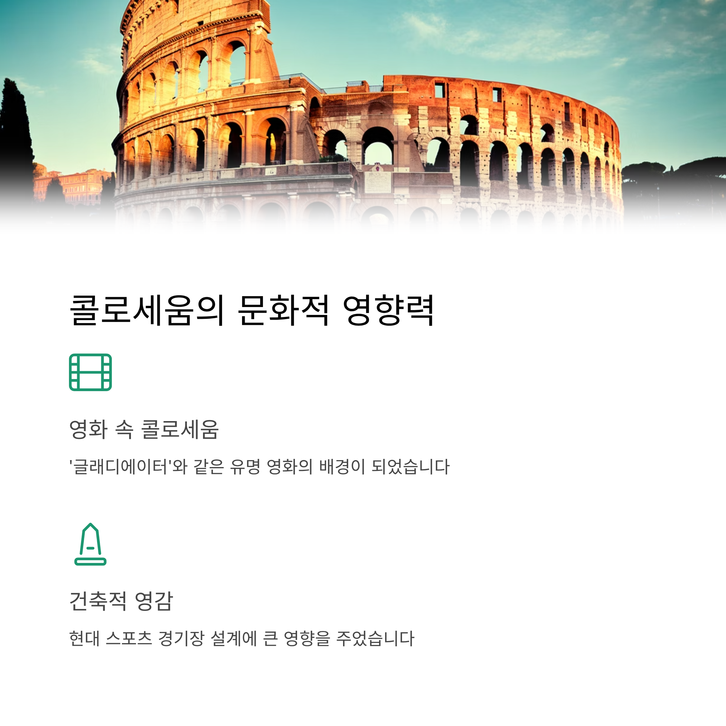 넷째, '시대를 초월한 문화적 영감'입니다. 콜로세움은 영화 '글래디에이터'를 비롯한 수많은 영화, 소설, 드라마, 게임, 미술 작품 등 현대 문화 콘텐츠의 주요 배경이자 영감이 되어왔습니다. 그 웅장한 모습과 역사적인 이야기는 오늘날에도 여전히 많은 사람들의 상상력을 자극합니다. 🎬