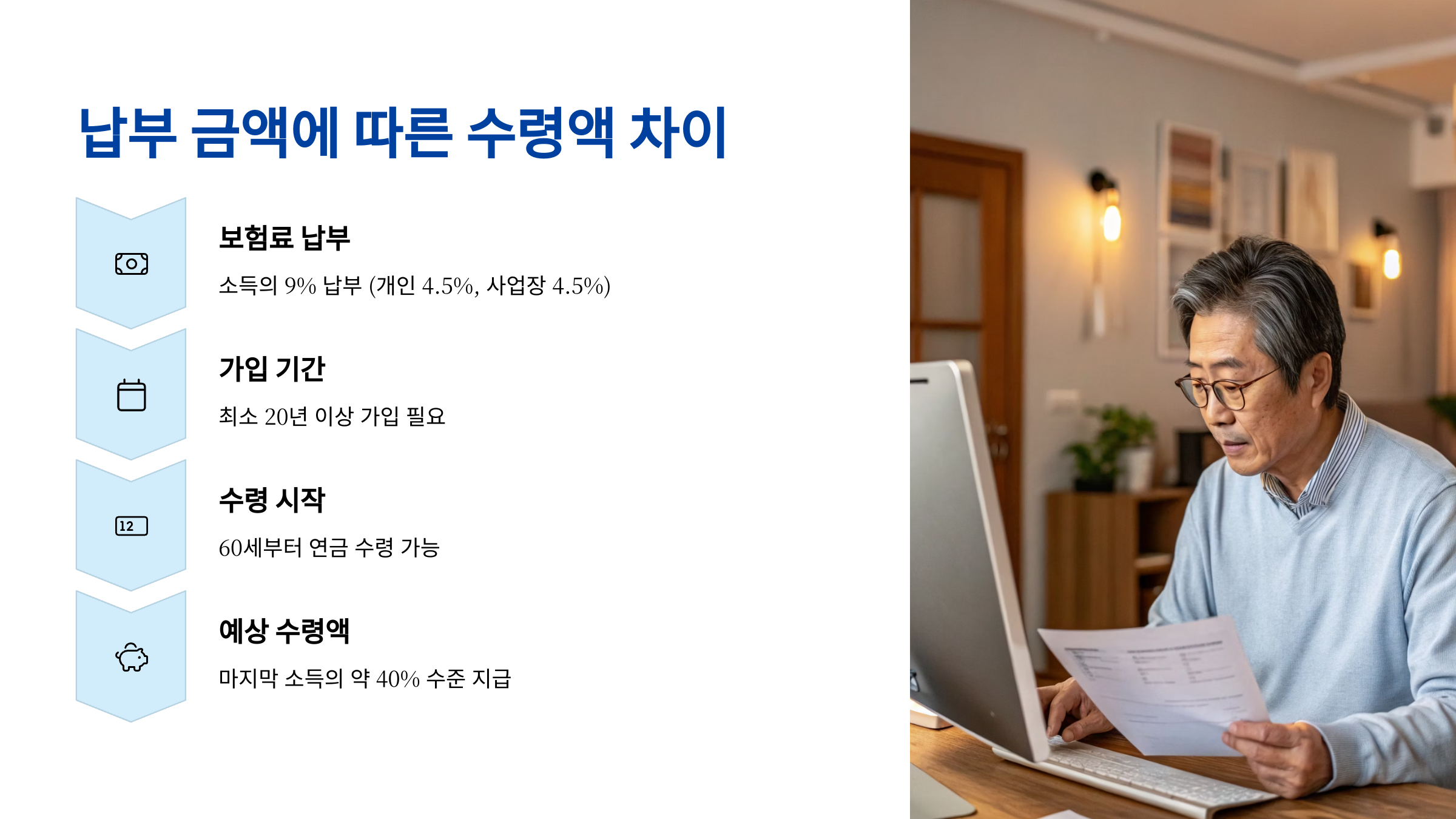 연금의 지급 방식은 가입 기간과 평균소득을 반영해 계산된 ‘기초연금액 + 부가연금액’으로 구성돼요. 이 구조 덕분에 같은 보험료를 납부했더라도 가입 기간과 소득 수준에 따라 수령액이 차이날 수밖에 없어요. 그래서 "얼마나 오래, 얼마나 많이"가 핵심이에요.