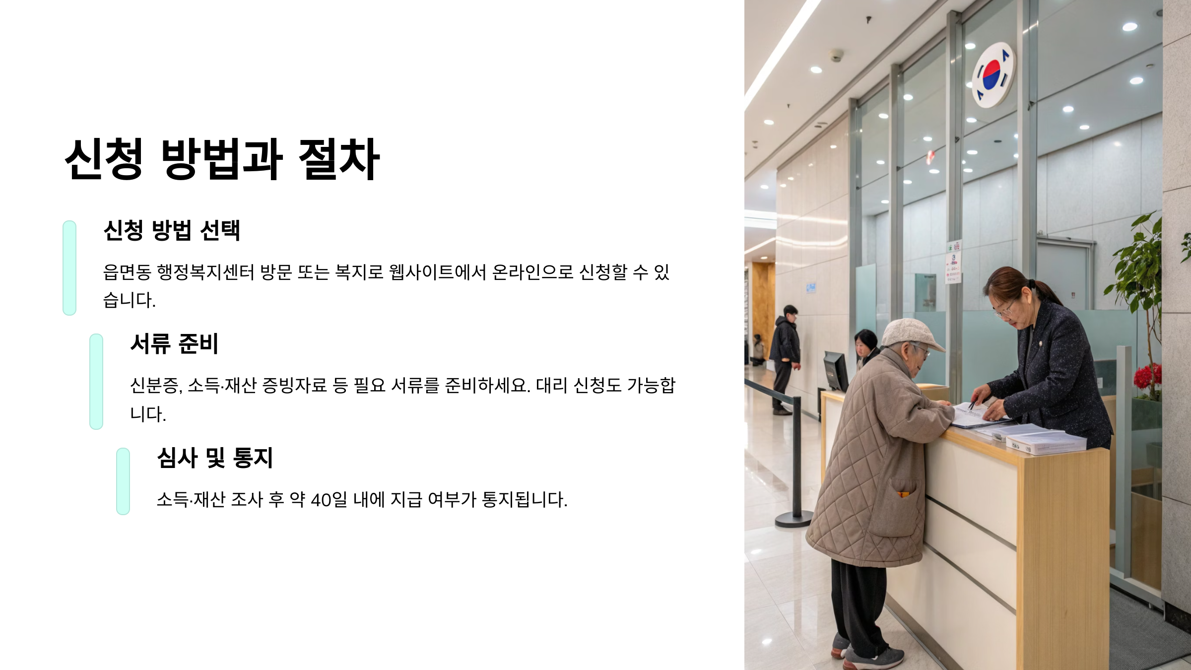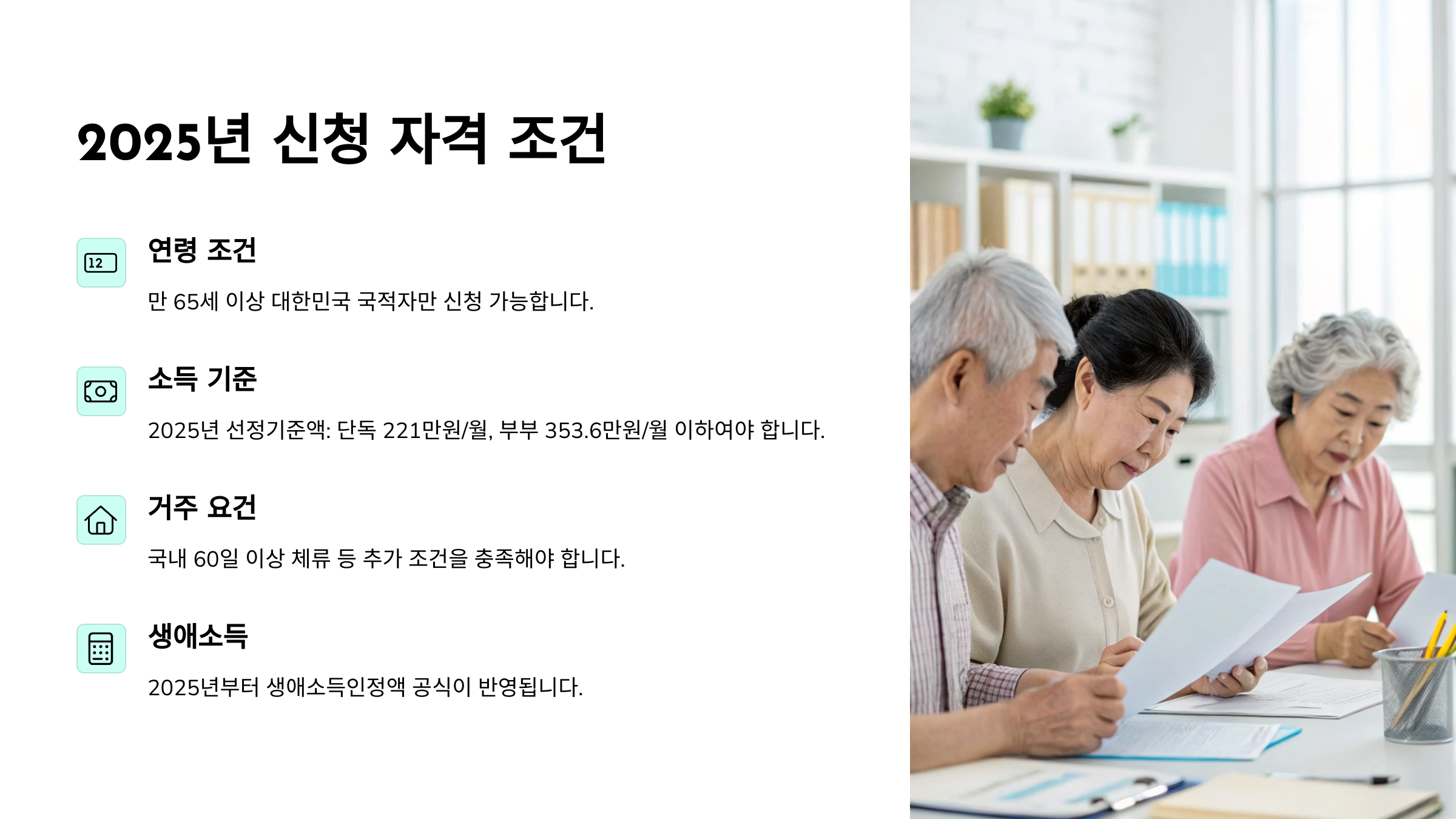 조건이 조금 복잡할 수 있지만, 기본적으로는 만 65세 이상 + 소득인정액 기준 이하만 기억하면 돼요. 나머지는 신청 시 전문가가 도와주니 걱정 마세요. 🙌