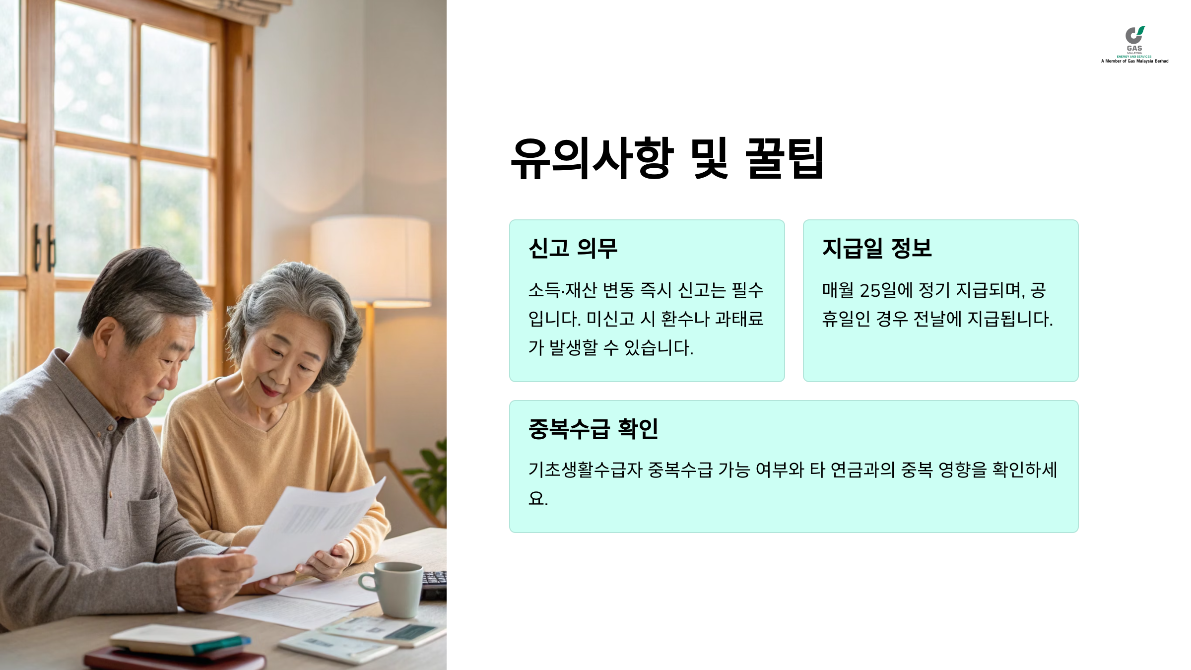 일곱 번째는 **매년 1~2월에 지급 기준이 조정된다는 점**이에요. 해마다 물가상승률이나 정부 예산을 반영해 지급액이 조정되니, 꼭 새해 초에는 한 번 확인해보는 게 좋아요. 📅