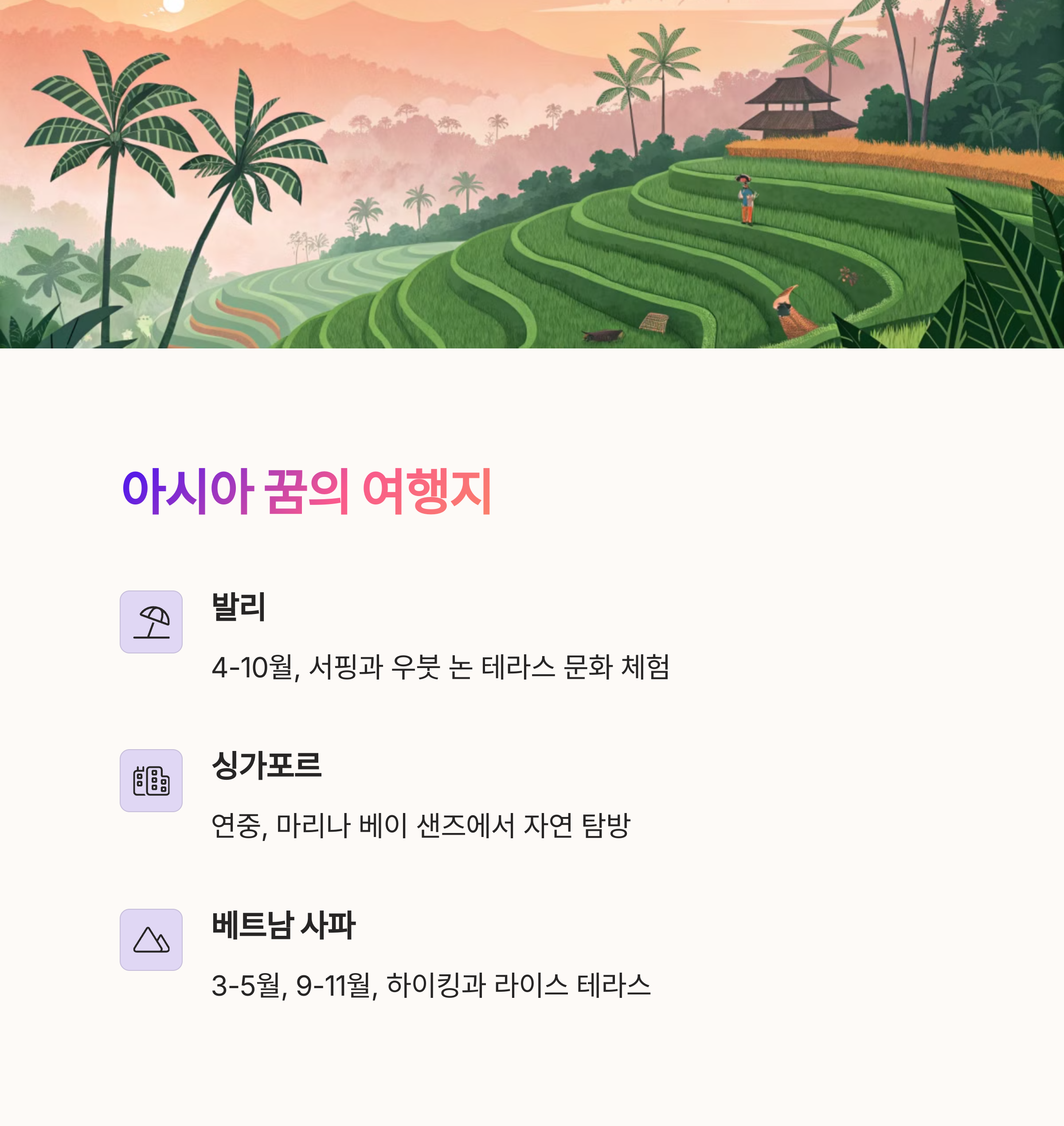 각각의 여행지에서 주어진 최적 방문 시기를 참고하여 꿈같은 여름 휴가를 준비해 보세요!
