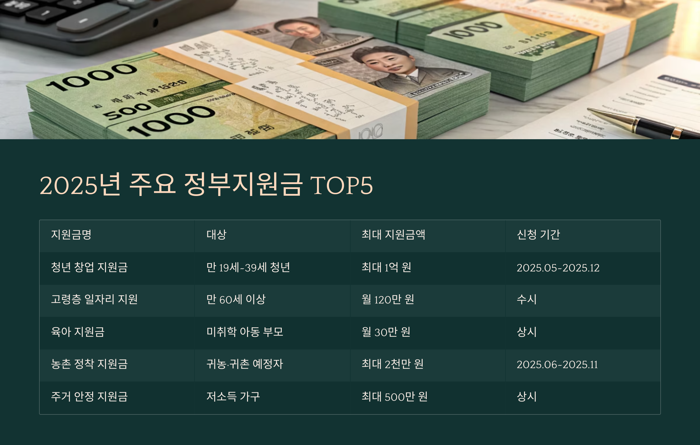 2025년 주요 정부지원금 TOP5 (표 정리)
