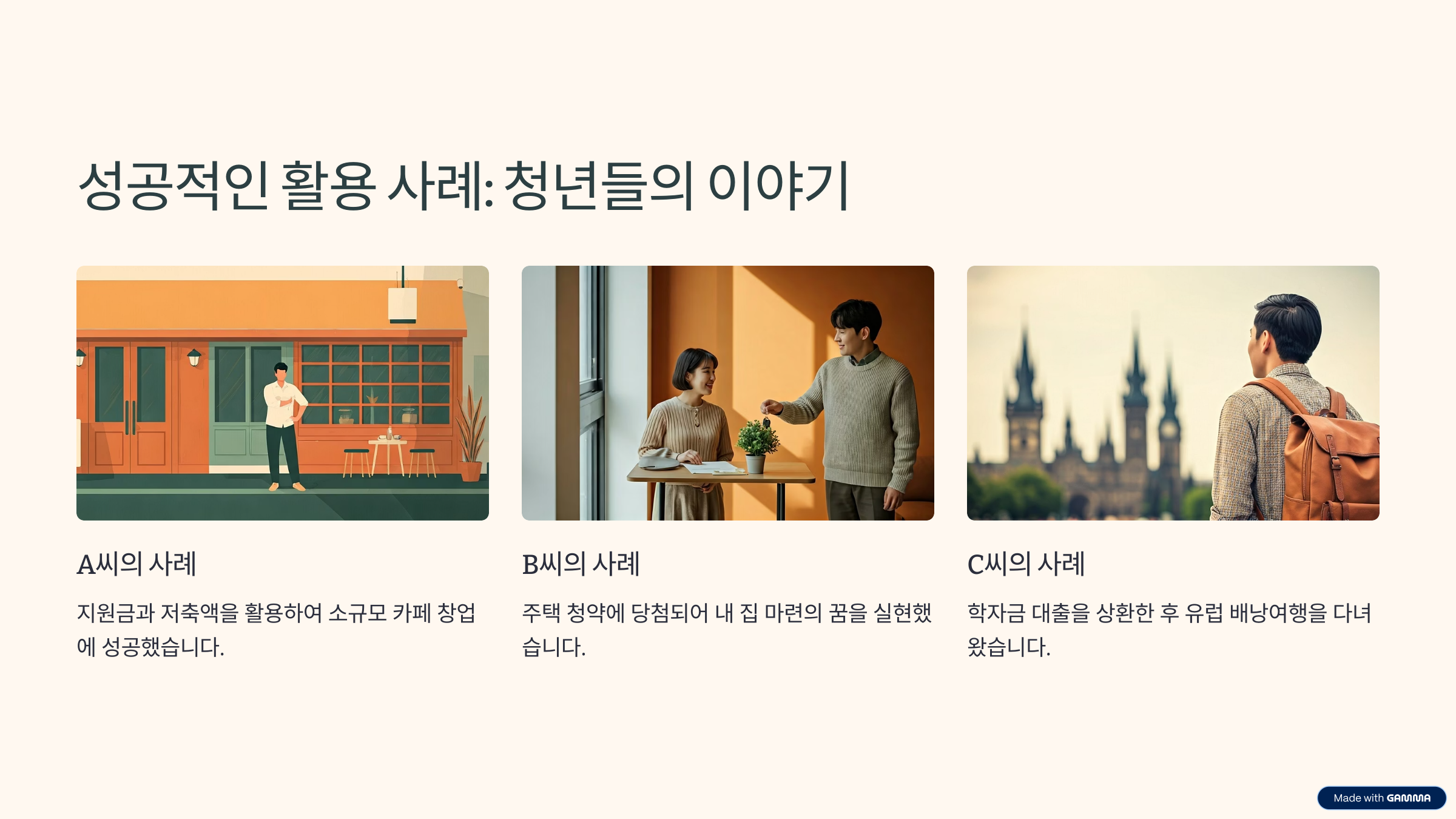 이처럼 청년 지원 통장은 다양한 방식으로 활용할 수 있어요. 청년들이 잘 활용한다면, 자산을 빠르게 축적하고, 경제적 자립을 이룰 수 있을 거예요! 💪