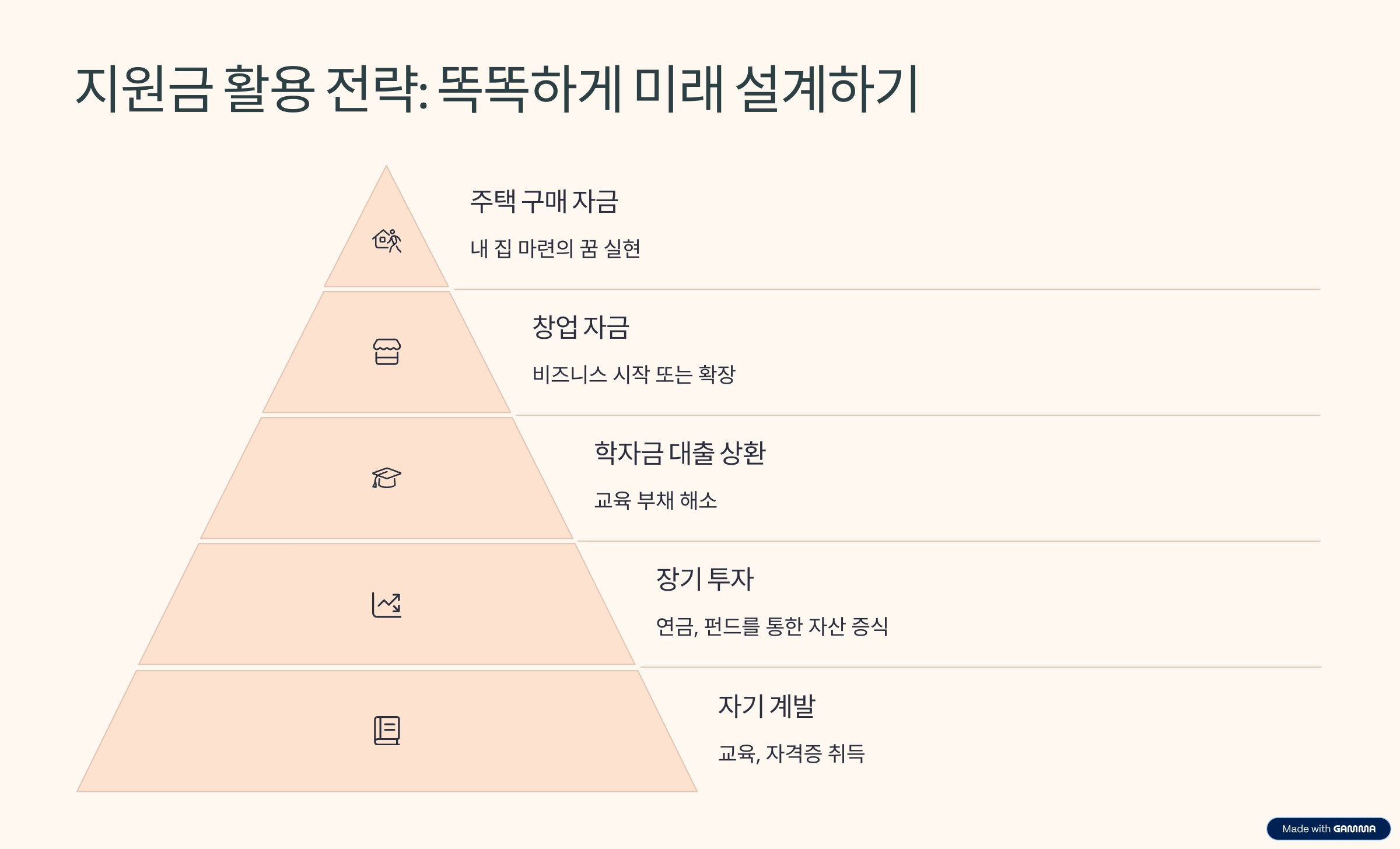 우선, 지원금은 주거비나 창업 자금 등 실제 생활에 필요한 항목에 활용하는 것이 가장 좋은 방법이에요. 예를 들어, 집을 구할 때 청년 지원 통장의 자금을 활용하면, 초기 자금을 마련하는 데 큰 도움이 될 거예요. 또 다른 예시로는, 창업을 꿈꾸는 청년들이 이 자금을 활용하여 사업 아이템을 실현할 수 있는 기회가 될 수 있어요. 이러한 활용법은 개인적인 재정 상황에 따라 유용하게 적용될 수 있어요.