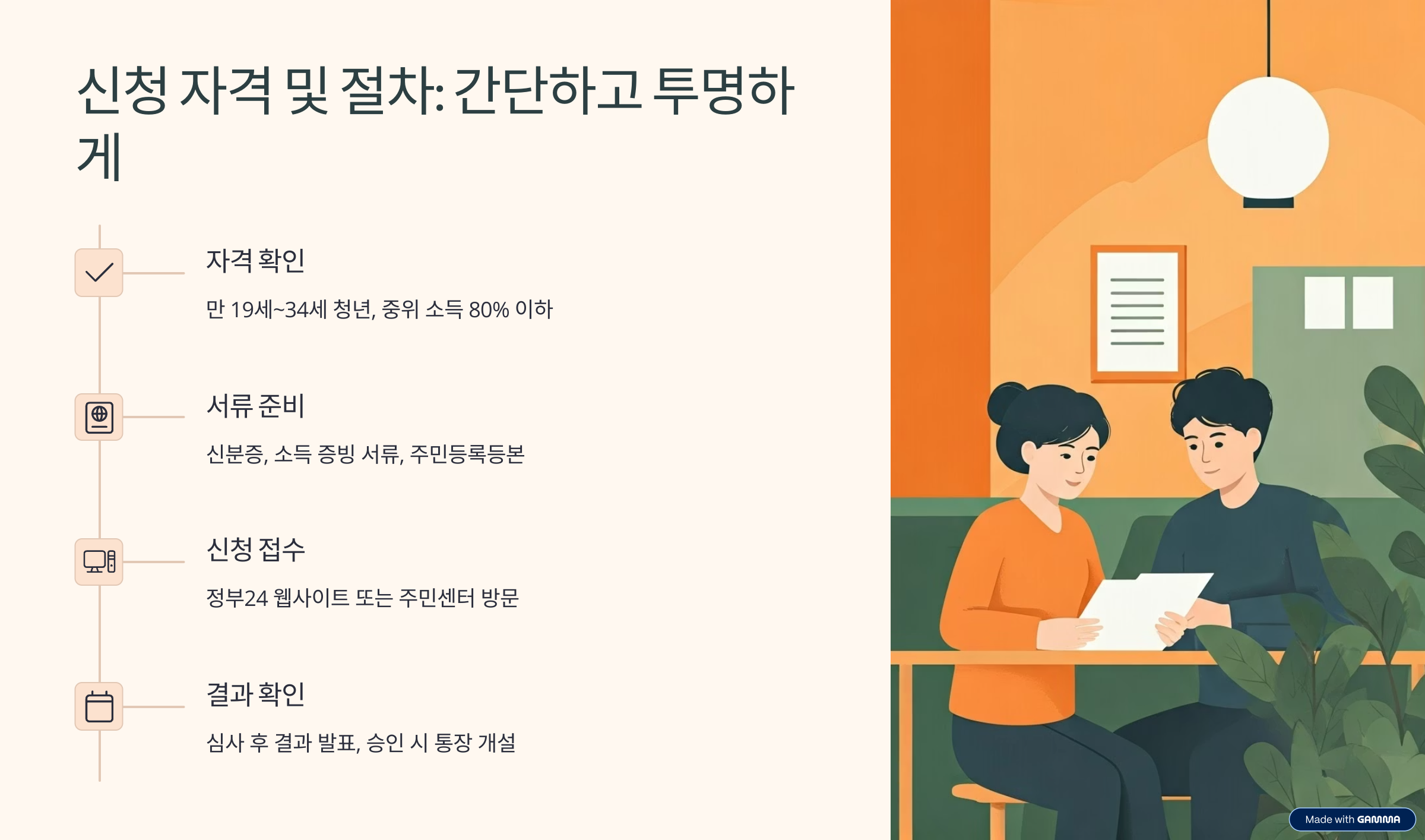 지원 절차는 크게 두 가지 단계로 나눠져 있어요. 첫 번째는 해당 은행에서 청년 지원 통장을 개설하는 거고, 두 번째는 매달 일정 금액을 저축하는 거예요. 이 과정에서 청년들은 본인의 통장을 통해 정부에서 제공하는 추가 지원금을 받을 수 있게 돼요. 💼