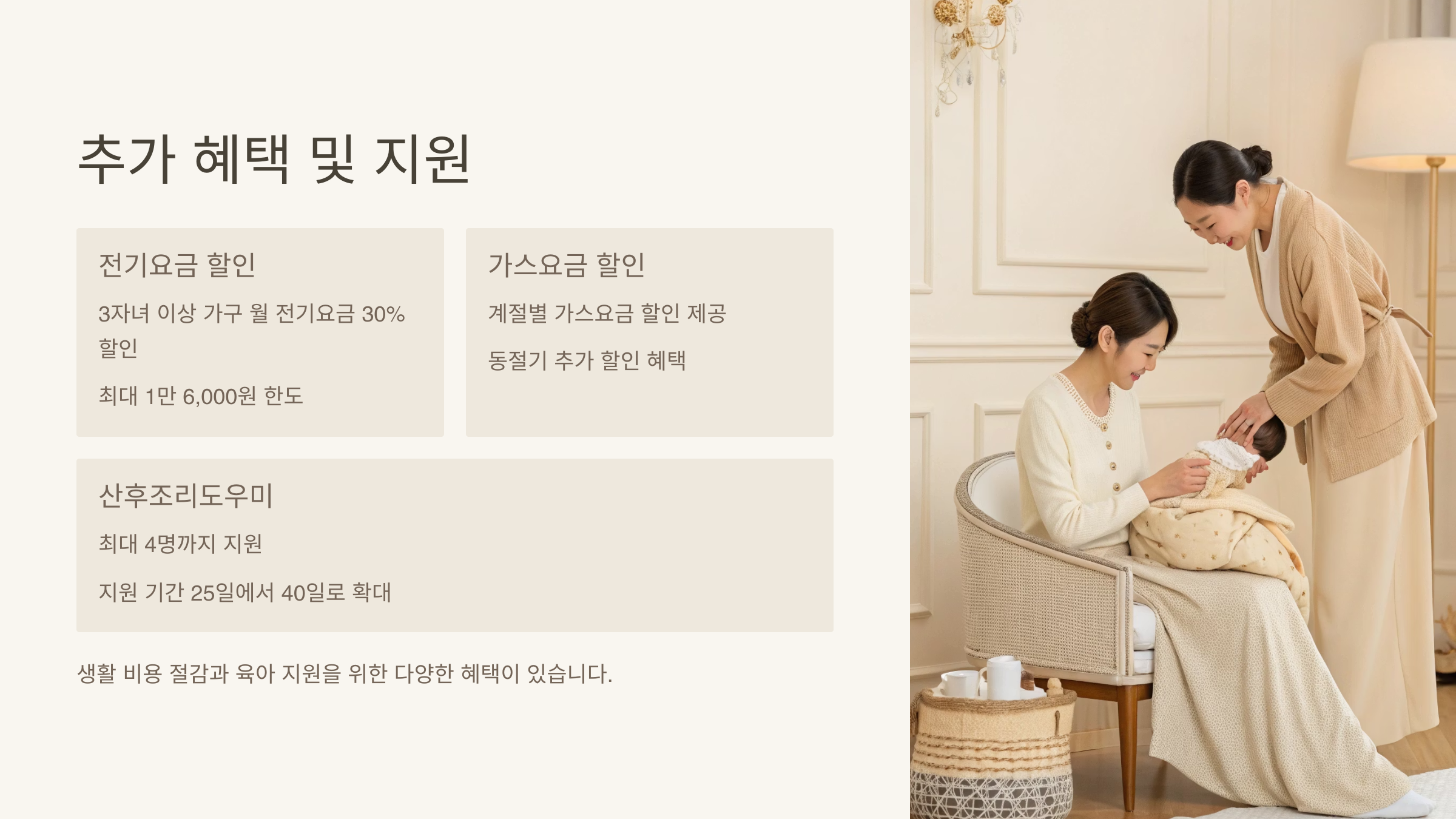 출산장려금은 단순히 현금만 지원하는 게 아니에요. 2025년 현재는 다양한 부가 혜택이 함께 제공돼서 신생아를 키우는 부모들에게 아주 유용하답니다. 출산 후부터 아이가 성장할 때까지 단계별로 혜택을 받을 수 있어요.