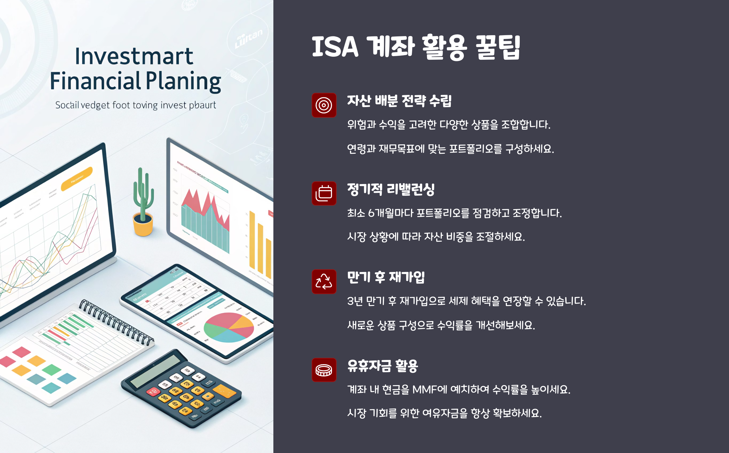 마지막 팁! 매년 연말쯤에는 납입 잔액과 수익률을 확인하고, 필요 시 리밸런싱(포트폴리오 조정)을 하는 게 좋아요. ISA도 ‘관리’가 답이에요. 📊