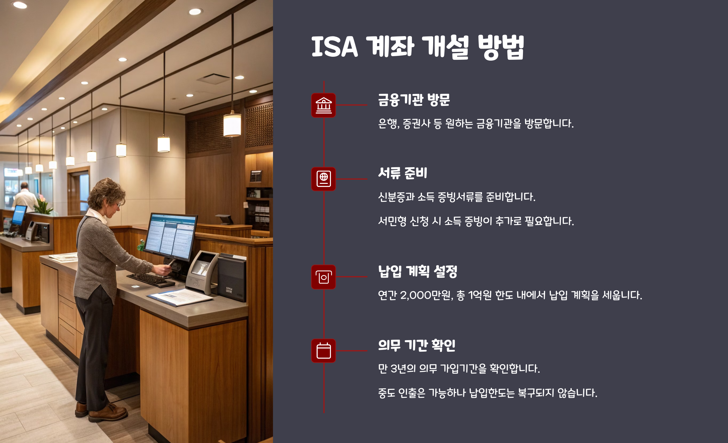 ISA 계좌 개설은 생각보다 간단해요. 요즘은 모바일 앱으로도 5분 만에 개설할 수 있을 정도로 절차가 간소화됐어요. 😊