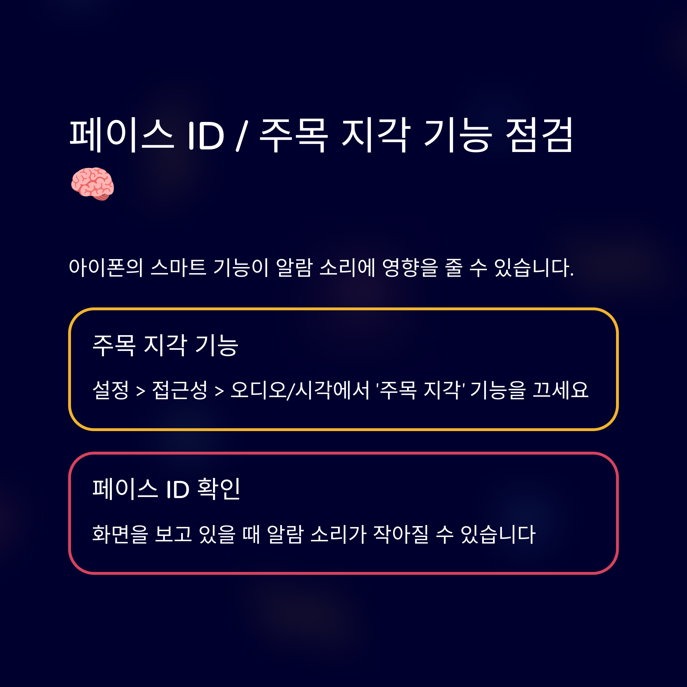 아이폰 X 이후 모델(Face ID가 탑재된 아이폰) 사용자라면, '주목 지각 기능(Attention Aware Features)'이 알람 소리 문제의 주요 원인일 수 있어요. 이 기능은 편리하지만, 알람에서는 당황스러움을 유발할 수 있답니다. 👁️🗨️