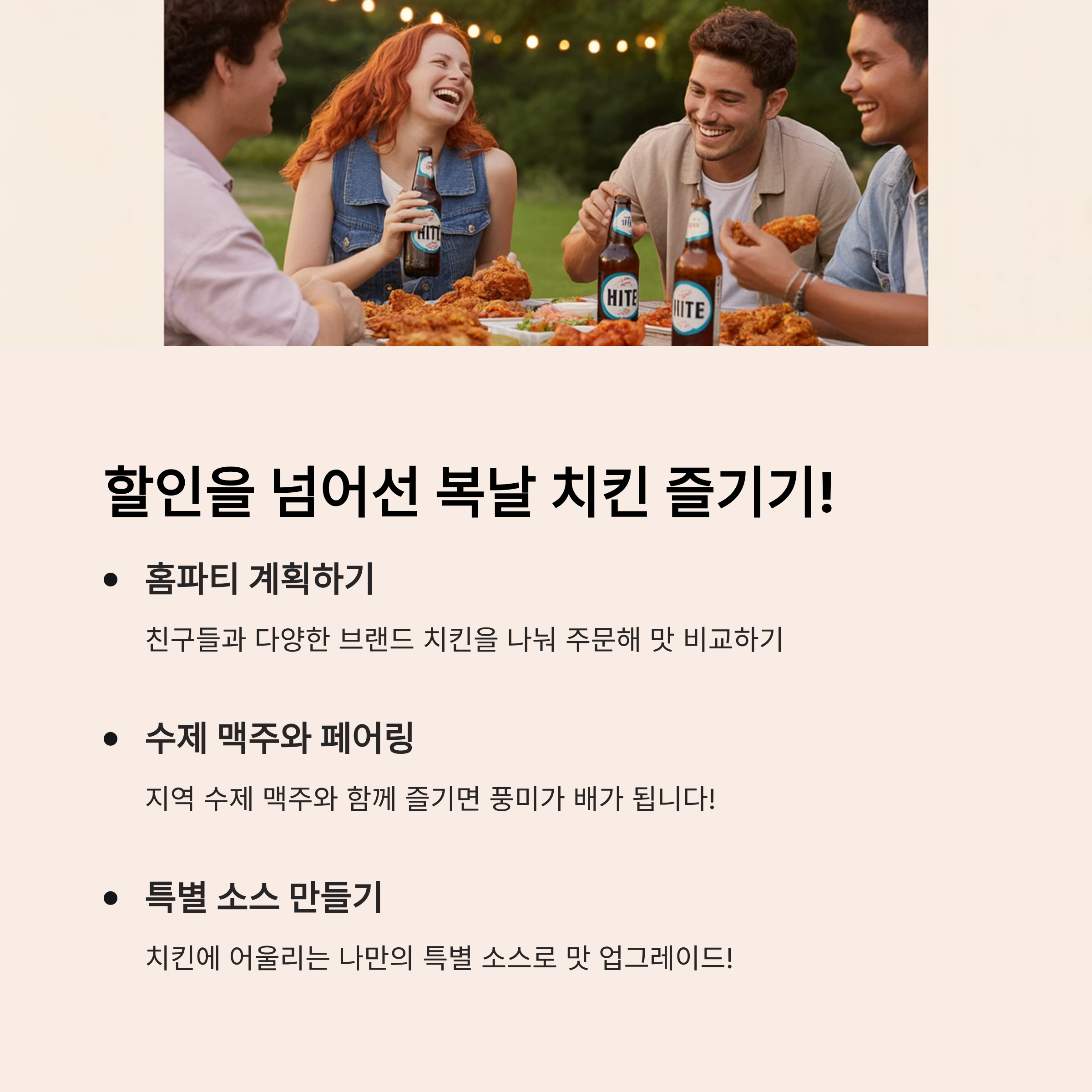 할인 혜택도 중요하지만, 복날 치킨을 더욱 특별하게 즐기는 방법들이 있어요. 할인을 넘어선 진정한 복날의 즐거움을 만끽해 보세요! 🍺