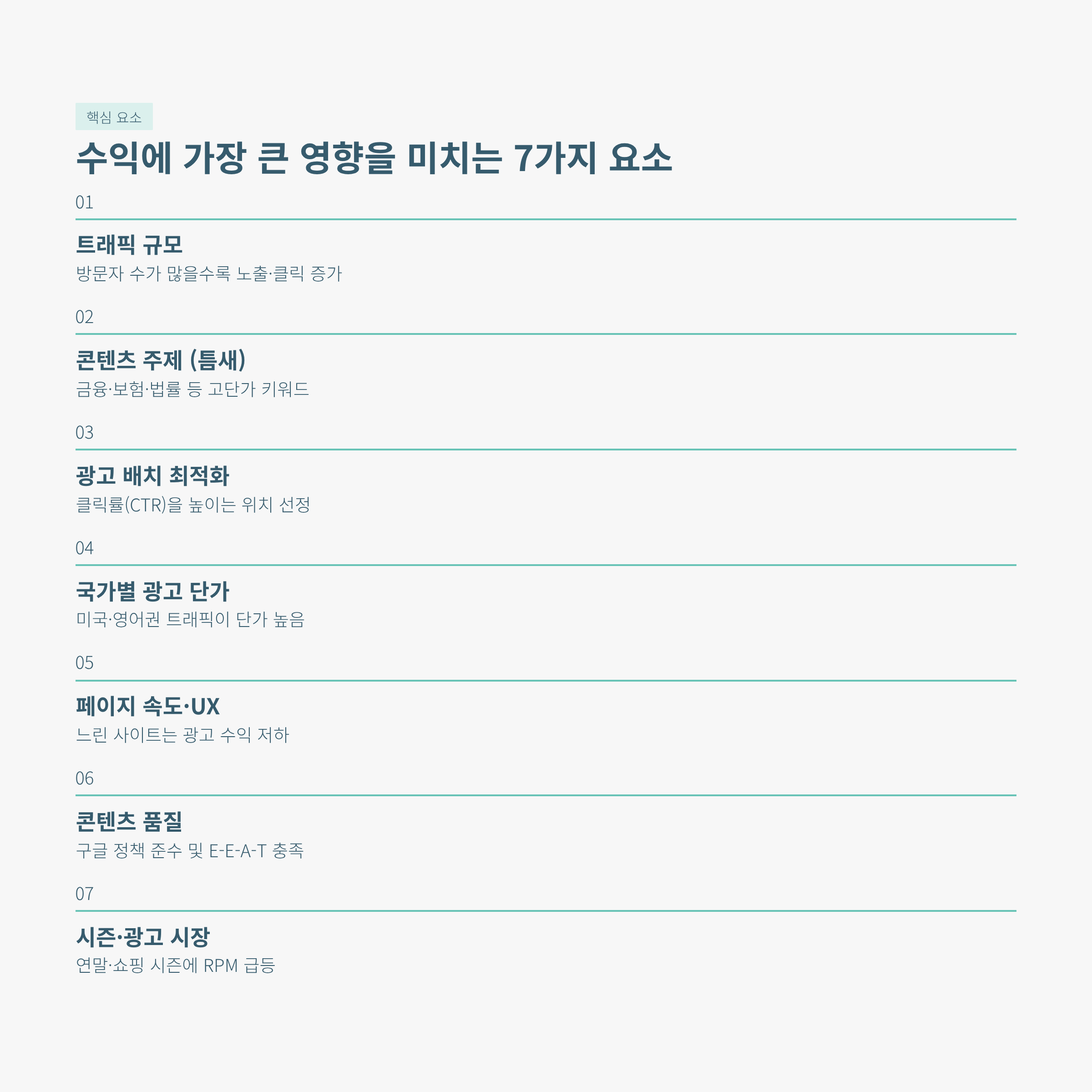 - 콘텐츠 주제 (금융·보험·법률·의료·테크 → RPM 매우 높음)