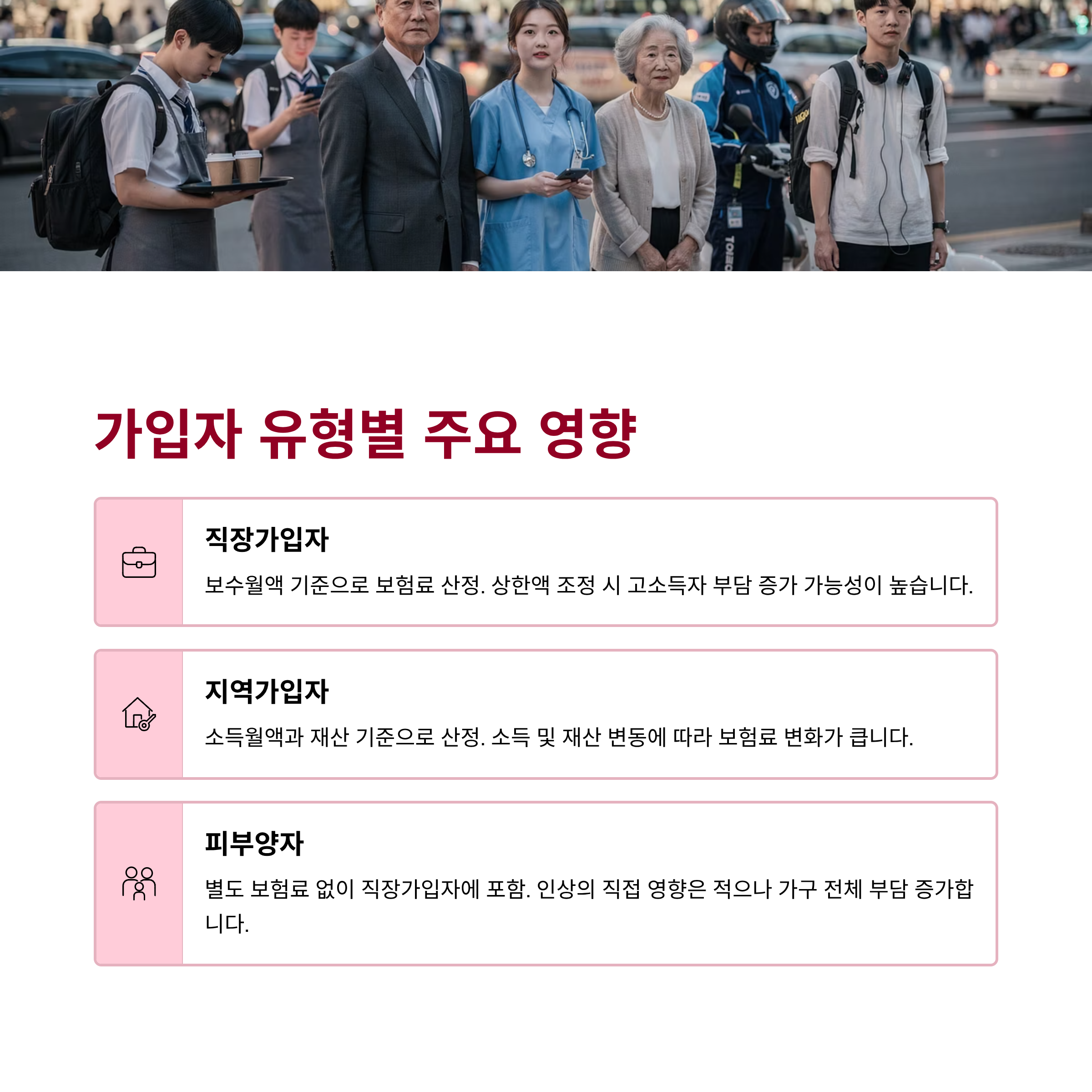 2026년 건강보험료율 및 보수월액(소득월액) 상한액·하한액 조정은 각 가입자 유형에 따라 다르게 영향을 미칩니다.
