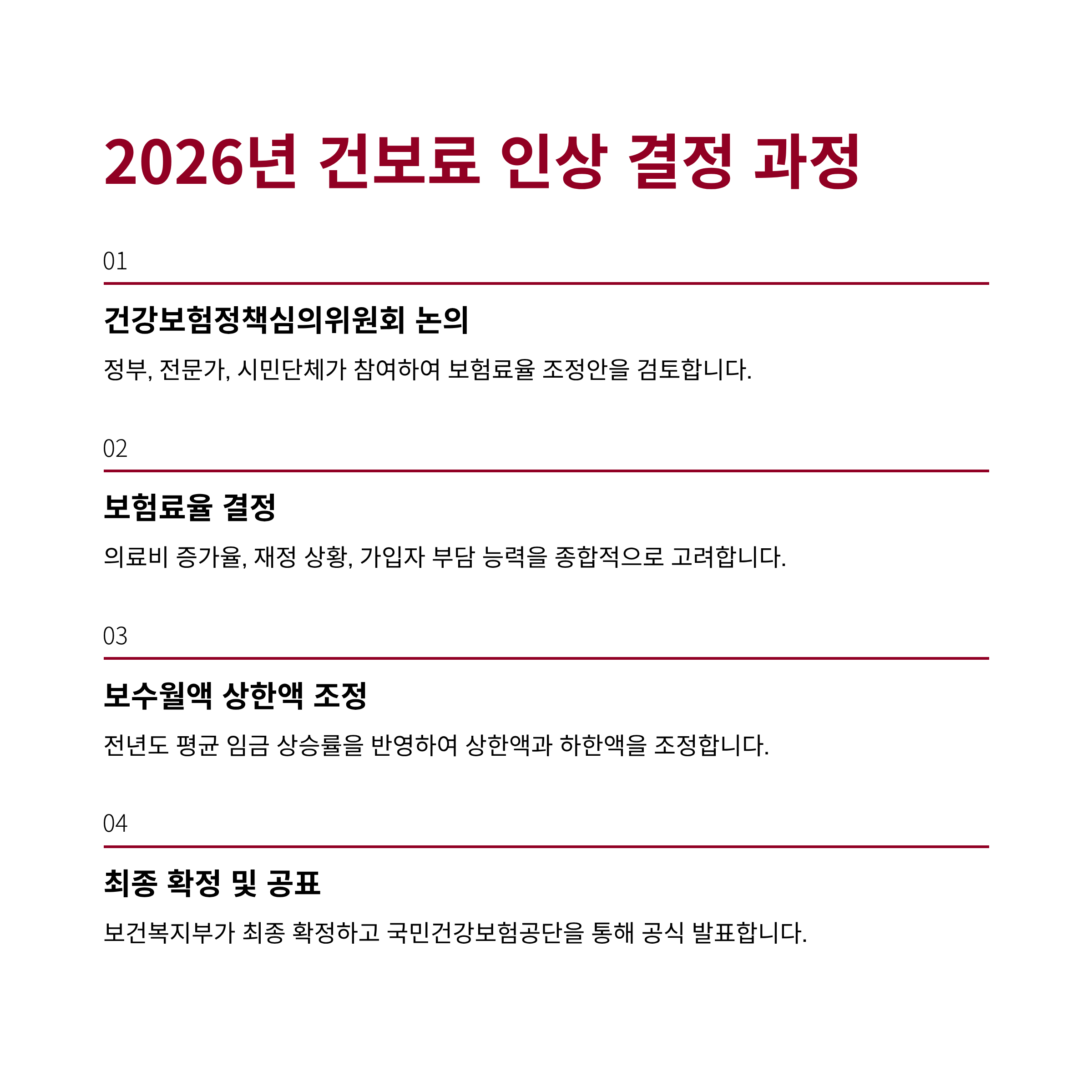2026년 국민건강보험료는 아직 확정되지 않았지만, 매년 다음과 같은 과정을 통해 결정됩니다.