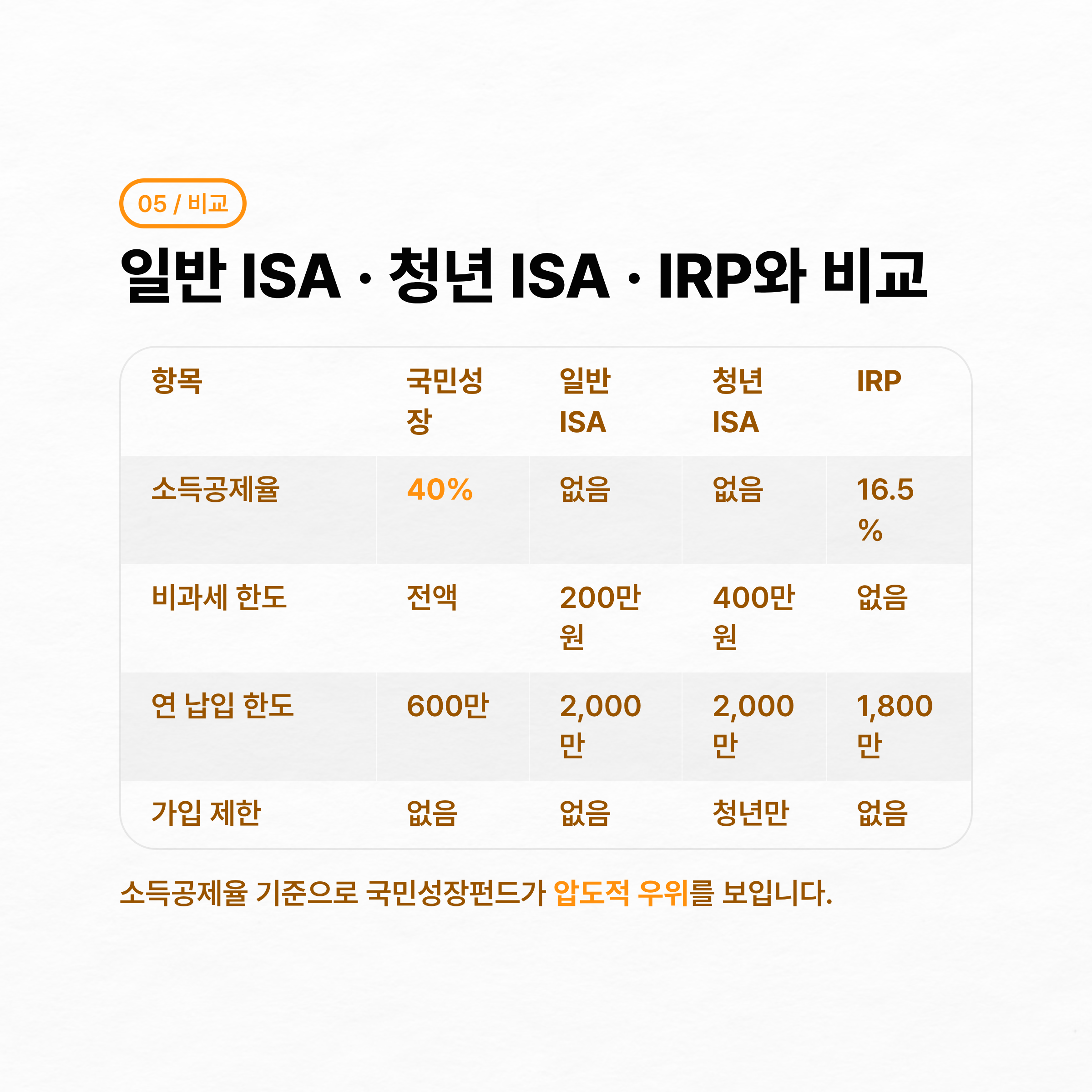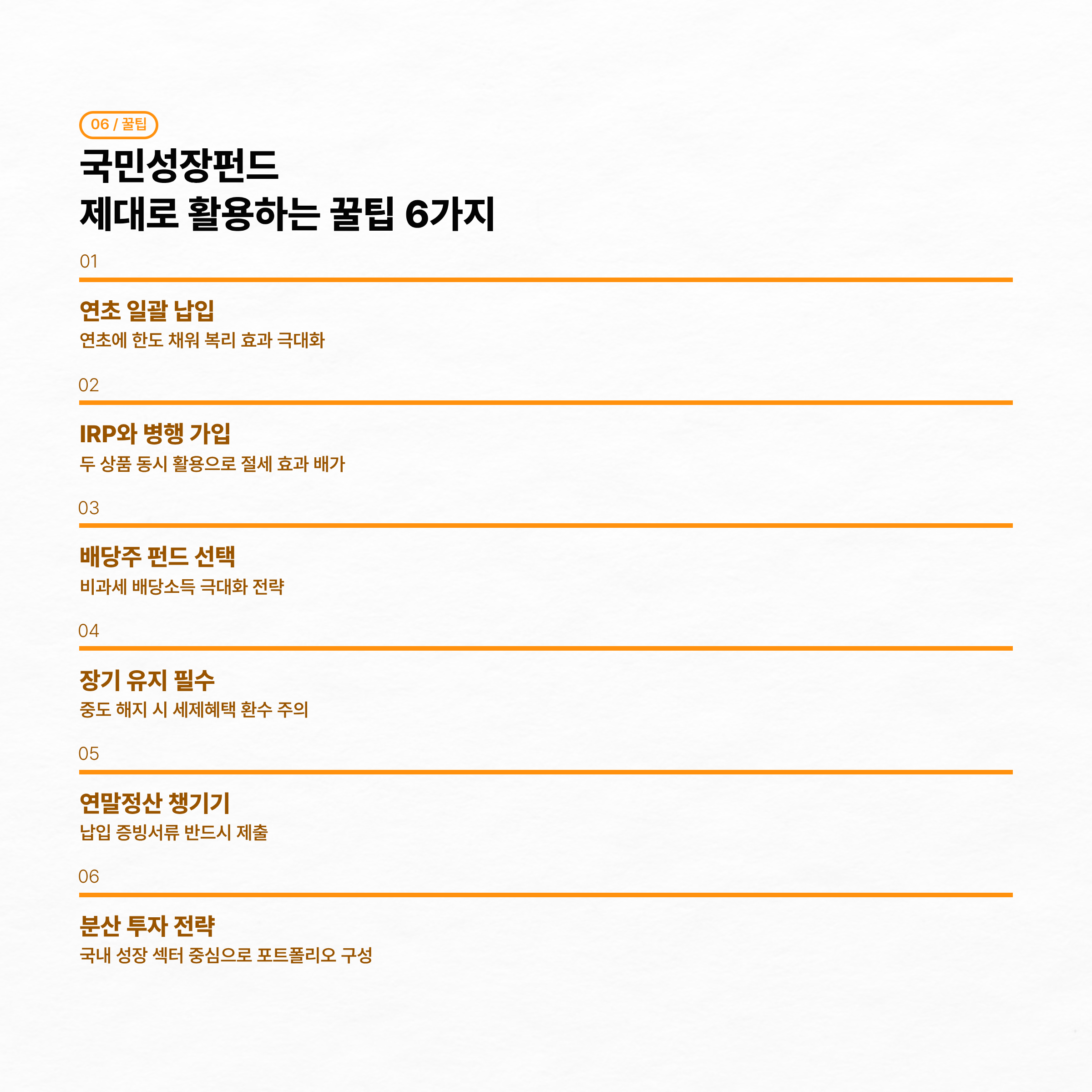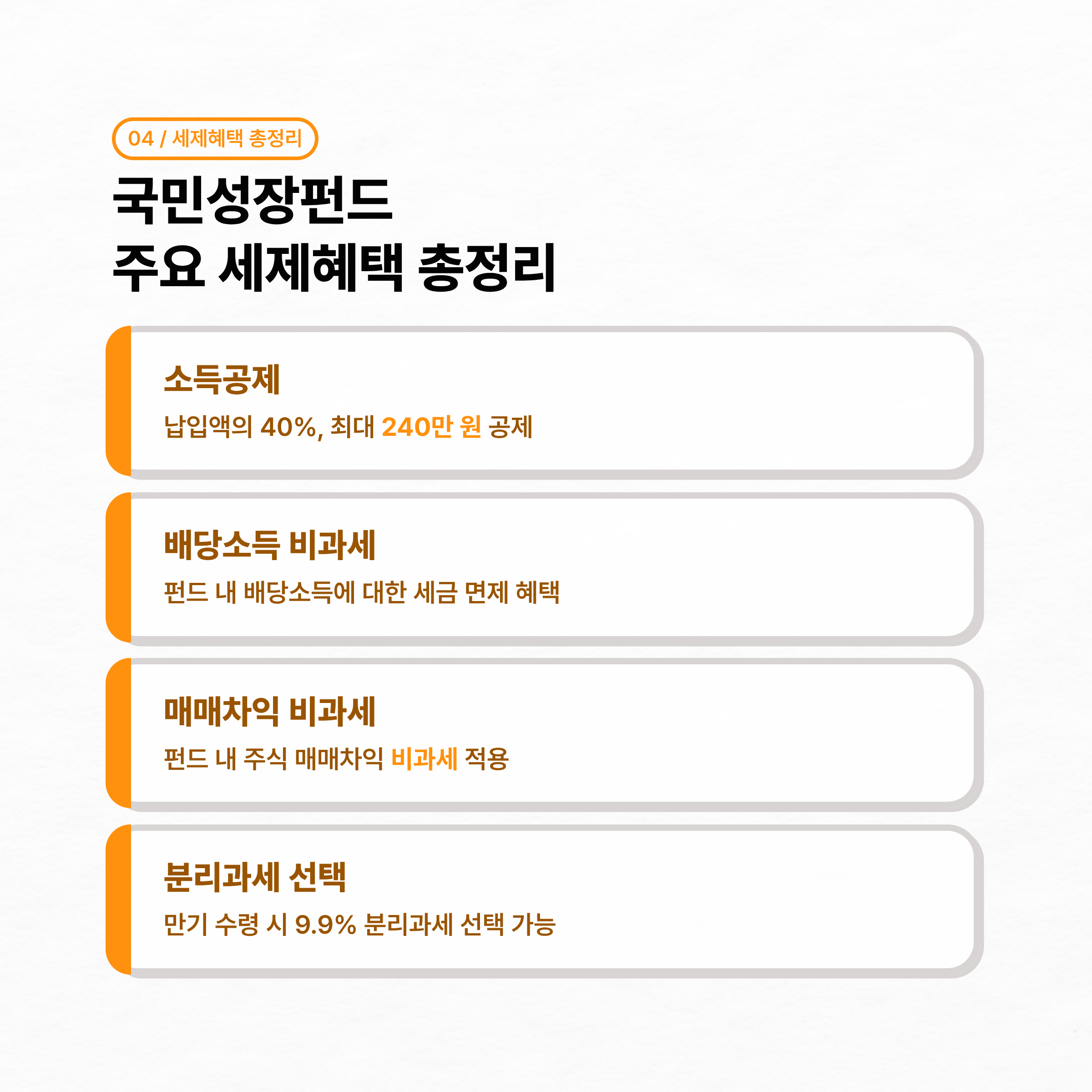 | 국민성장펀드 | 1,000만 원 | 소득공제 30~40% / 세액공제 16.5% | 중소·벤처·성장기업 |