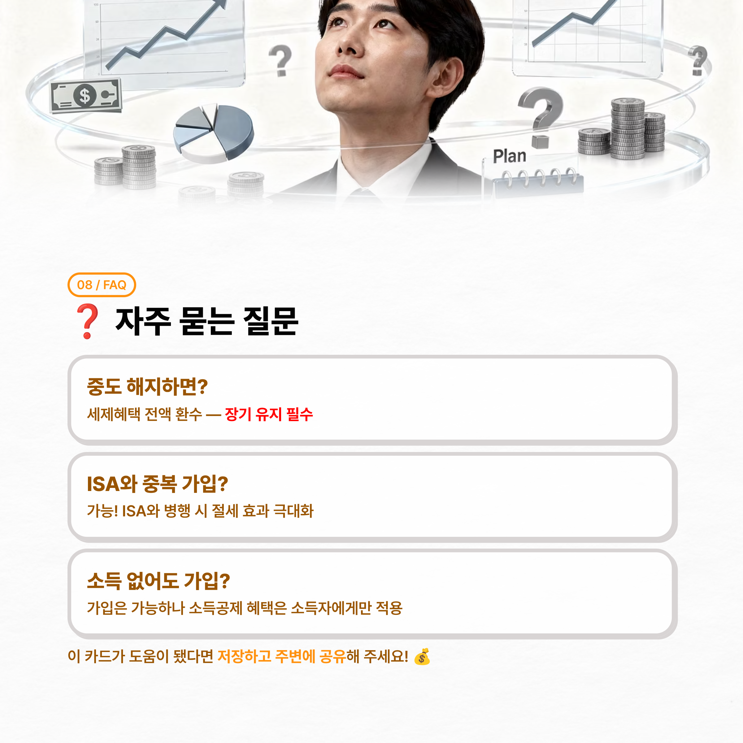 - 가입 기간: 3년 이상 장기 투자 시 추가 혜택 (비과세 전환 가능)