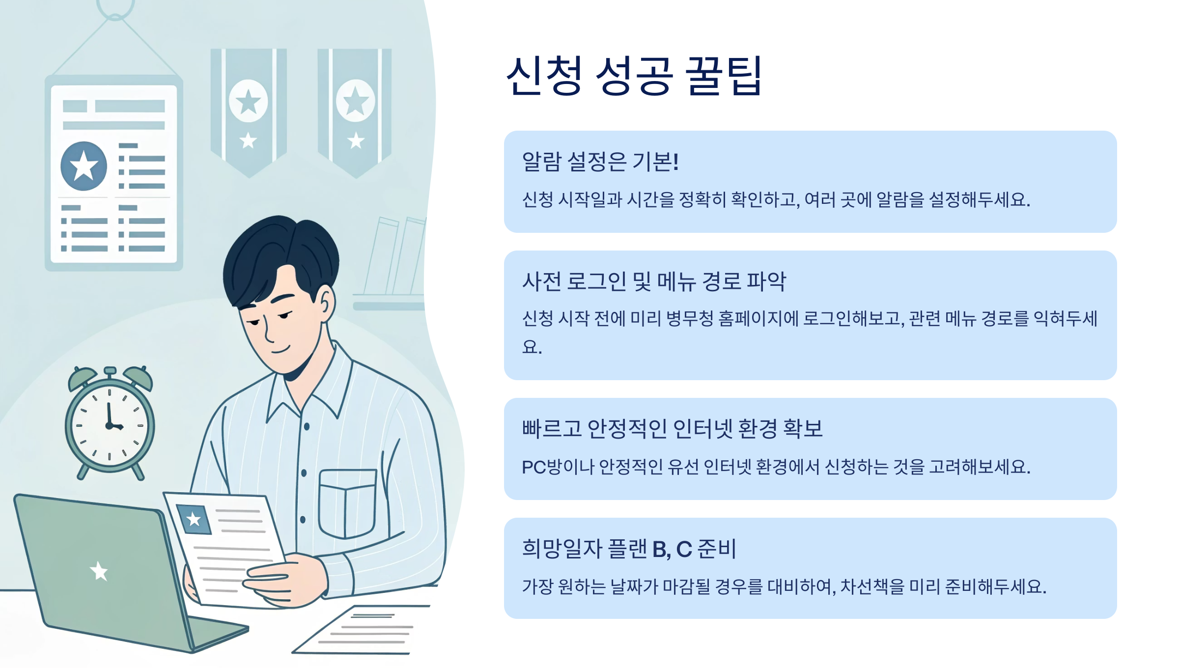 - ✅ 병무청 공지사항 수시 확인 (정확한 신청 시간, 방법, 유의사항 등 최종 공지 숙지)