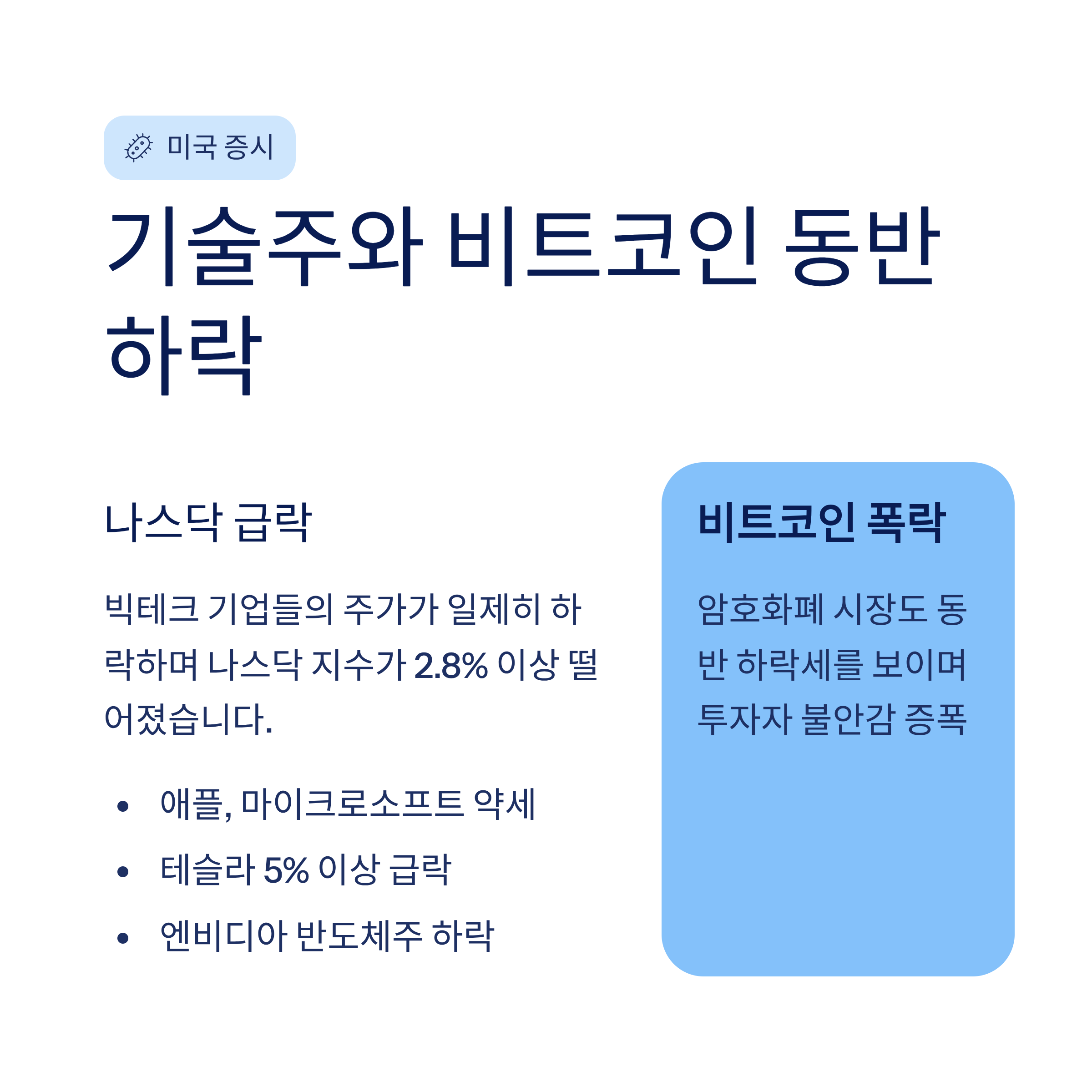 A2. 시장에 공포가 확산되면 투자자들은 위험 자산(주식, 가상화폐 등)을 먼저 매도하여 현금을 확보하려는 경향이 있습니다. 이번에는 유동성 회수 신호와 맞물려 하락폭이 컸습니다.