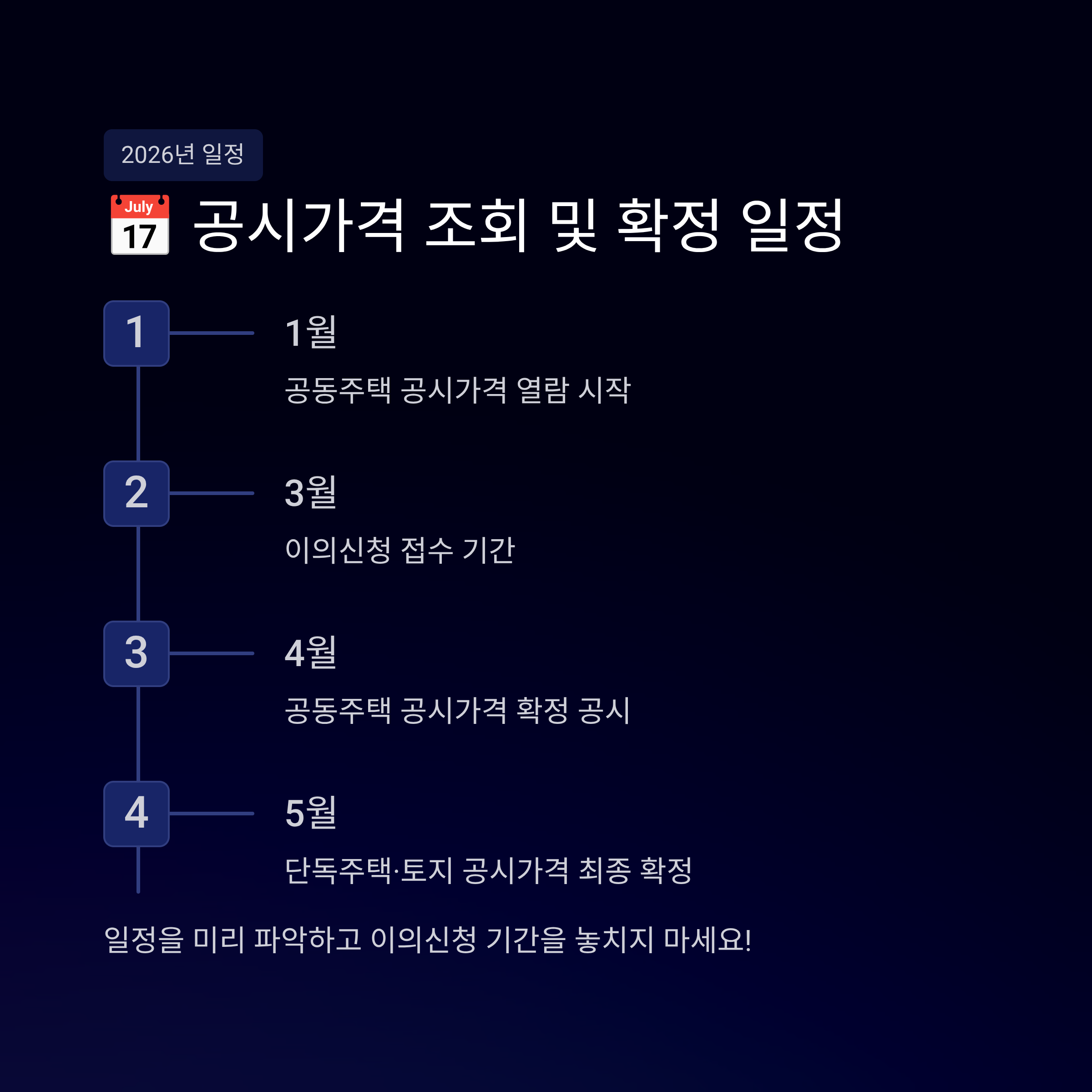 - 표준지/표준주택 공시가격: 2026년 1월 말 (개별 주택 가격 산정의 기준이 됨)