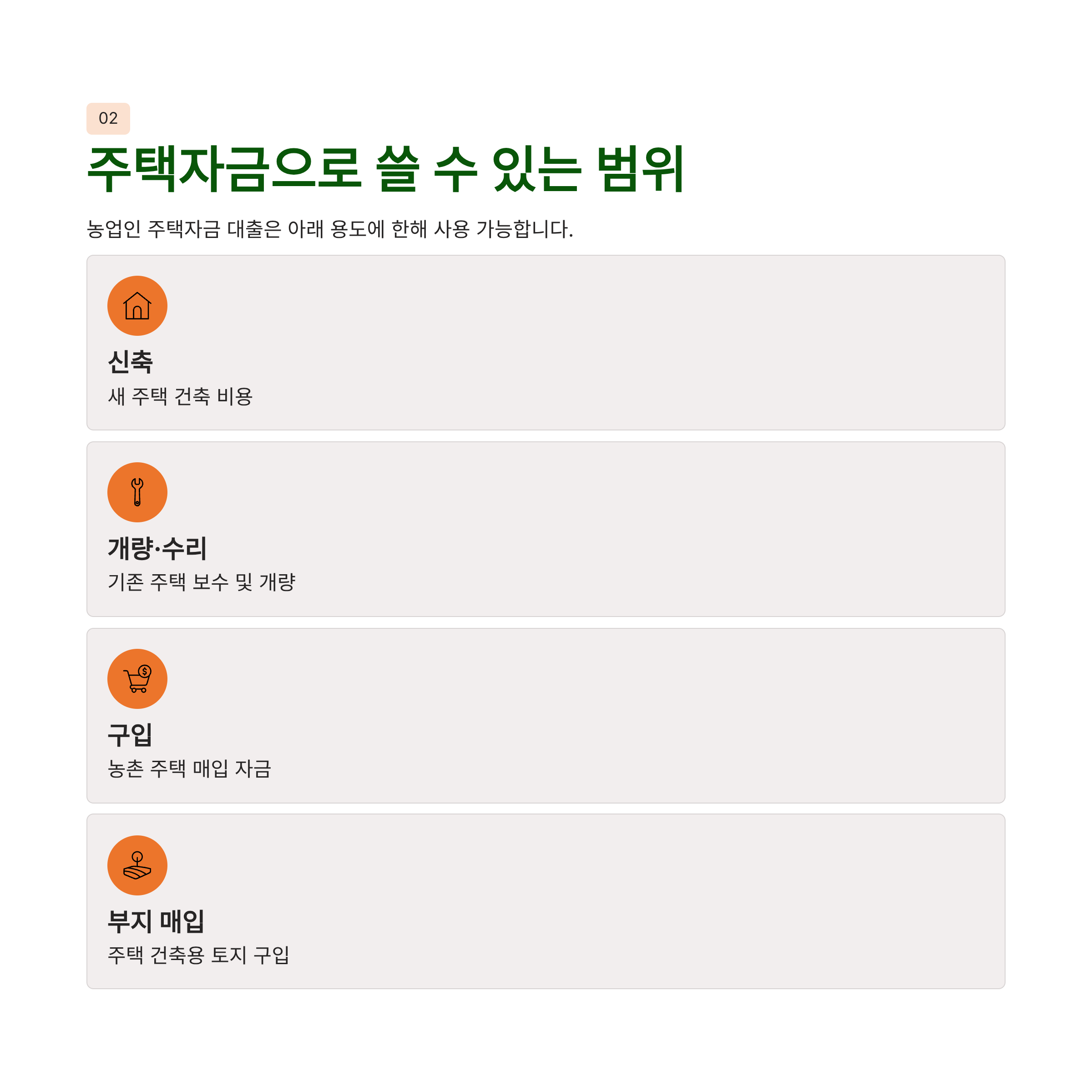 ⚠️ 농지 위 신축 주의: 농지에 주택을 새로 짓는 경우, 농지전용허가가 가능한 토지인지 먼저 확인이 필요합니다. 허가가 불가능한 농지는 지원 대상에서 제외됩니다.