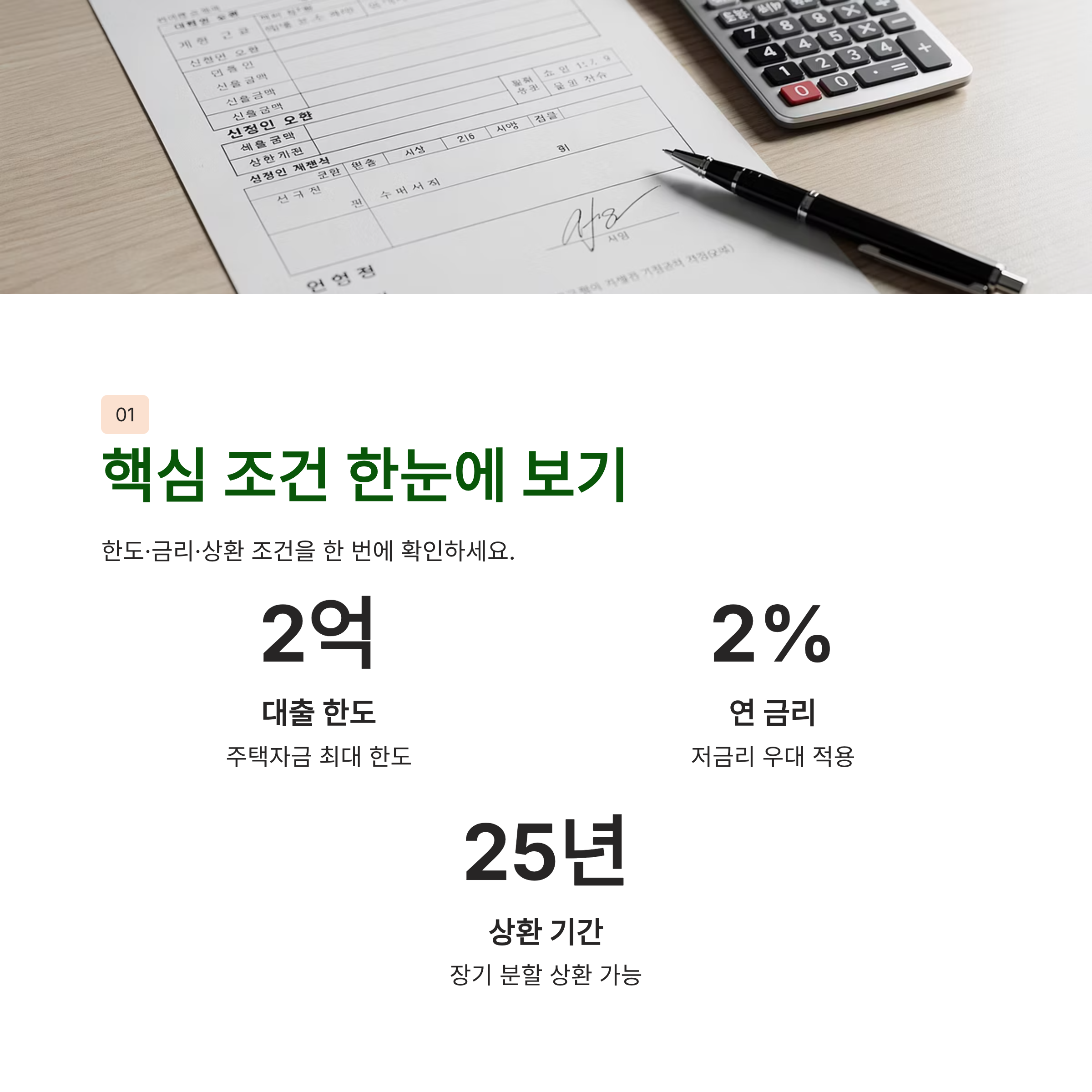 01 핵심 조건 한눈에 보기 (한도·금리·상환) 02 주택자금으로 쓸 수 있는 범위 03 신청 자격 (나이·거주·농업 조건) 04 신청 절차 단계별 안내 05 꼭 알아야 할 주의사항 06 문의처 및 신청 기관 07 자주 묻는 질문 FAQ📋 핵심 조건 한눈에 보기