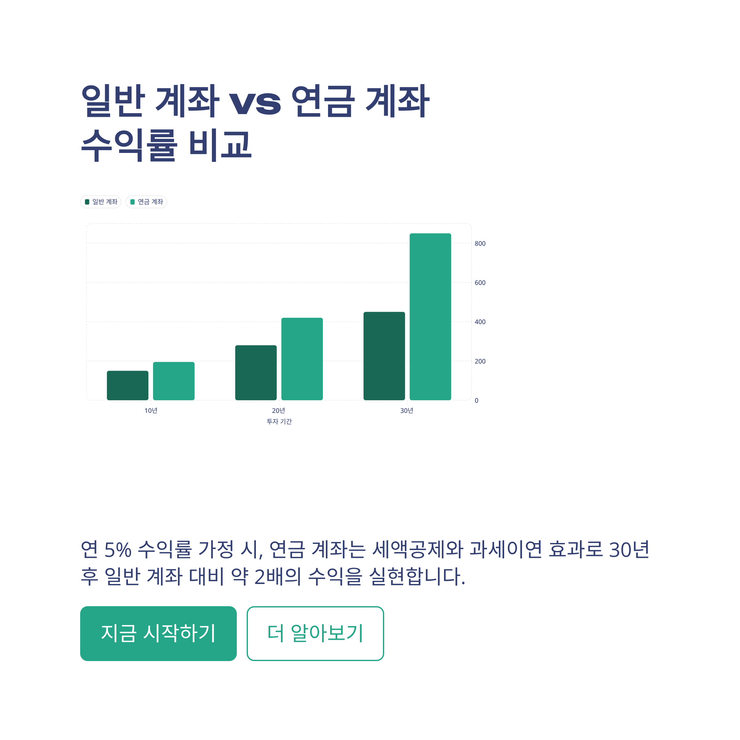 일반 계좌에서 배당을 받으면 15.4%의 세금을 즉시 떼지만, 연금계좌는 찾기 전까지 세금을 한 푼도 떼지 않습니다. 세금으로 나갈 돈이 원금에 합쳐져 계속 불어나기 때문에 2030처럼 투자 기간이 긴 세대에게는 엄청난 복리 효과를 제공합니다.
