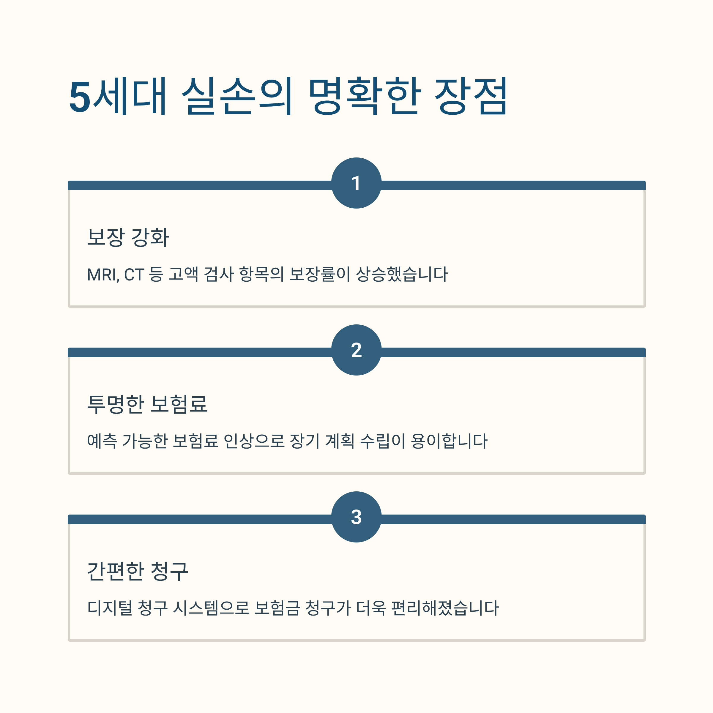 - 3. 안정적인 보험 유지를 원하는 분: 3년마다 보장 내용이 바뀔 수 있는 재가입 주기가 부담스럽다면 5세대는 불안정한 선택일 수 있어요.