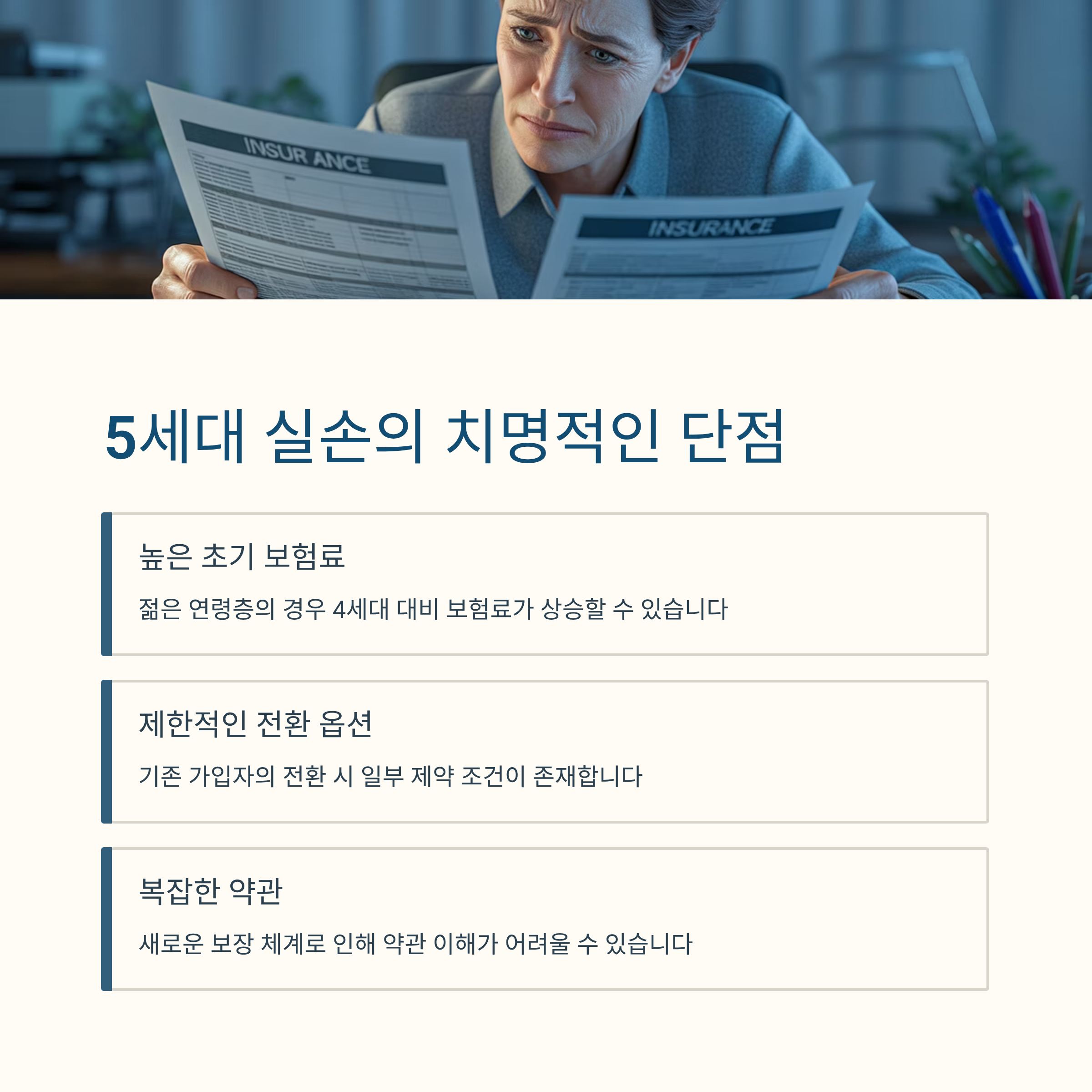 보험료가 1년마다 갱신되는 것은 4세대와 같지만, '재가입 주기'가 5년에서 3년으로 줄었어요. 재가입 시점에는 보험사가 상품 구조, 보장 내용, 자기부담금 등을 변경할 수 있어요. 즉, 3년마다 나에게 불리한 조건으로 상품이 바뀔 가능성이 커진 거죠. 안정성이 떨어졌다고 볼 수 있어요.