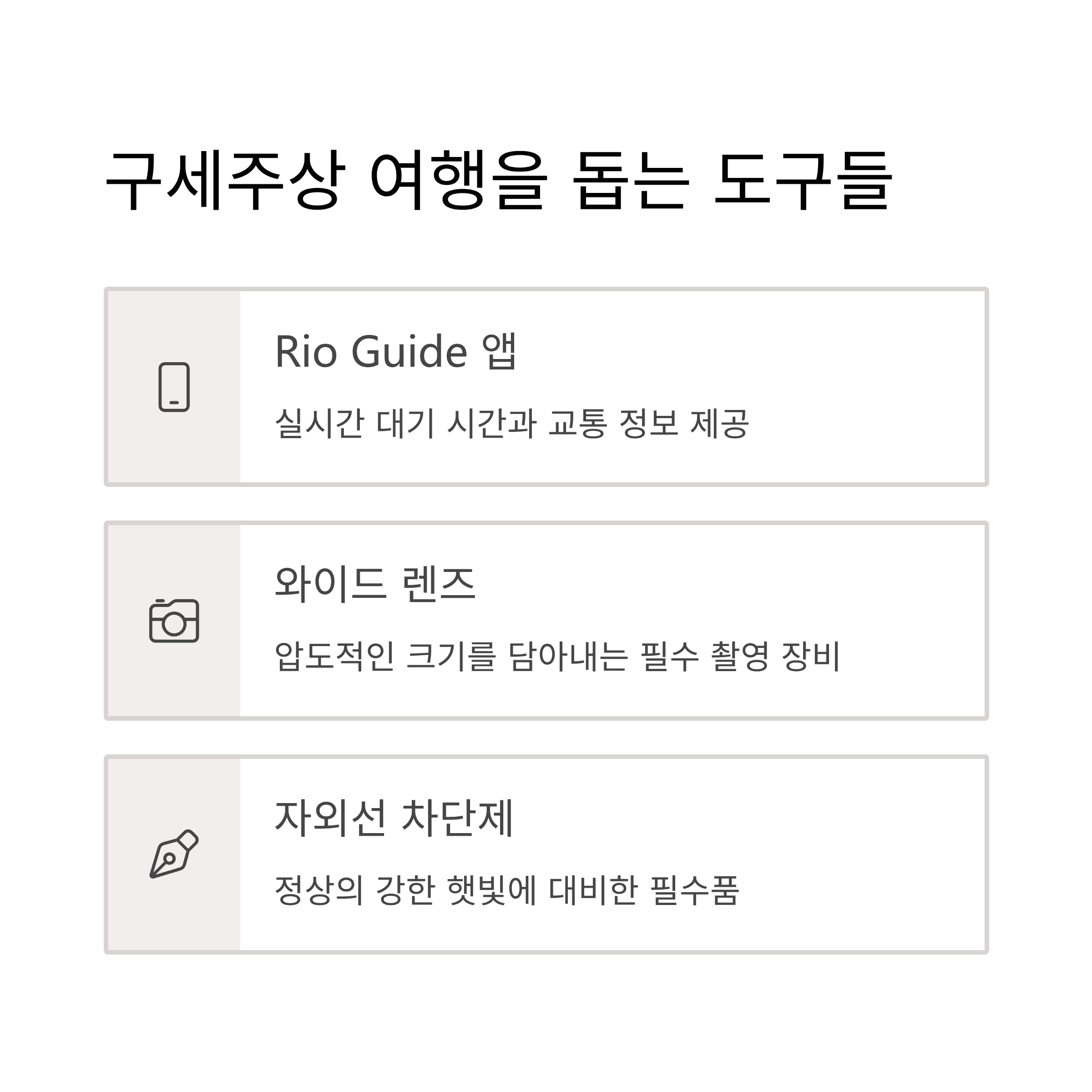 | 지도/대중교통 앱 | 리우 시내 길 찾기, 대중교통 노선/실시간 정보 | 현지에서 편리한 이동, 시간 효율 증대 | 자유 여행객, 대중교통 이용자 |